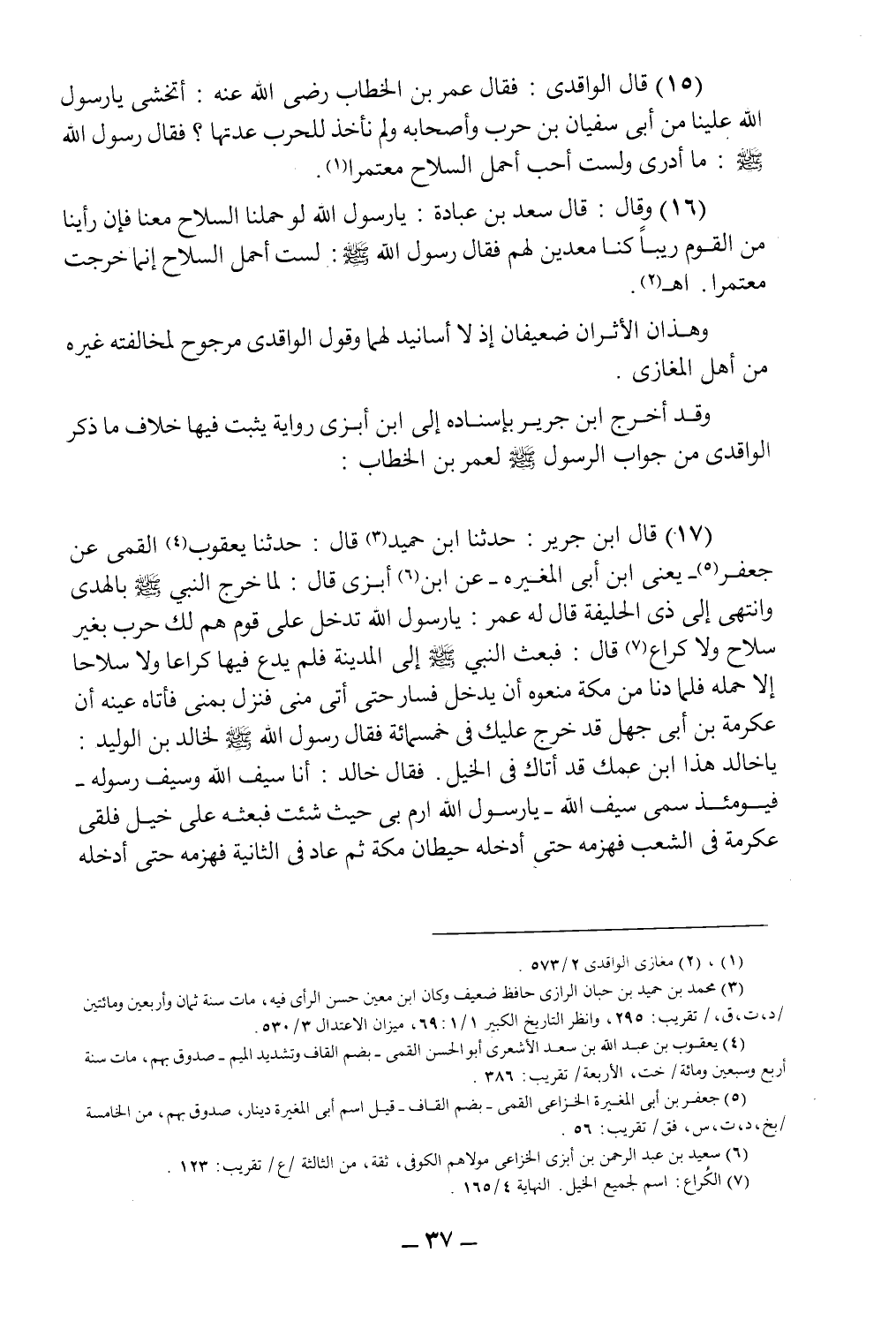 (16) وقال: قال سعد بن عبادة: يا رسول الله لو حملنا السلاح معنا فإن رأينا من القوم ريباً كنا معدين لهم، فقال رسول الله صلى الله عليه وسلم: "لست احمل السلاح، إنما خرجت معتمراً" ا. هـ2