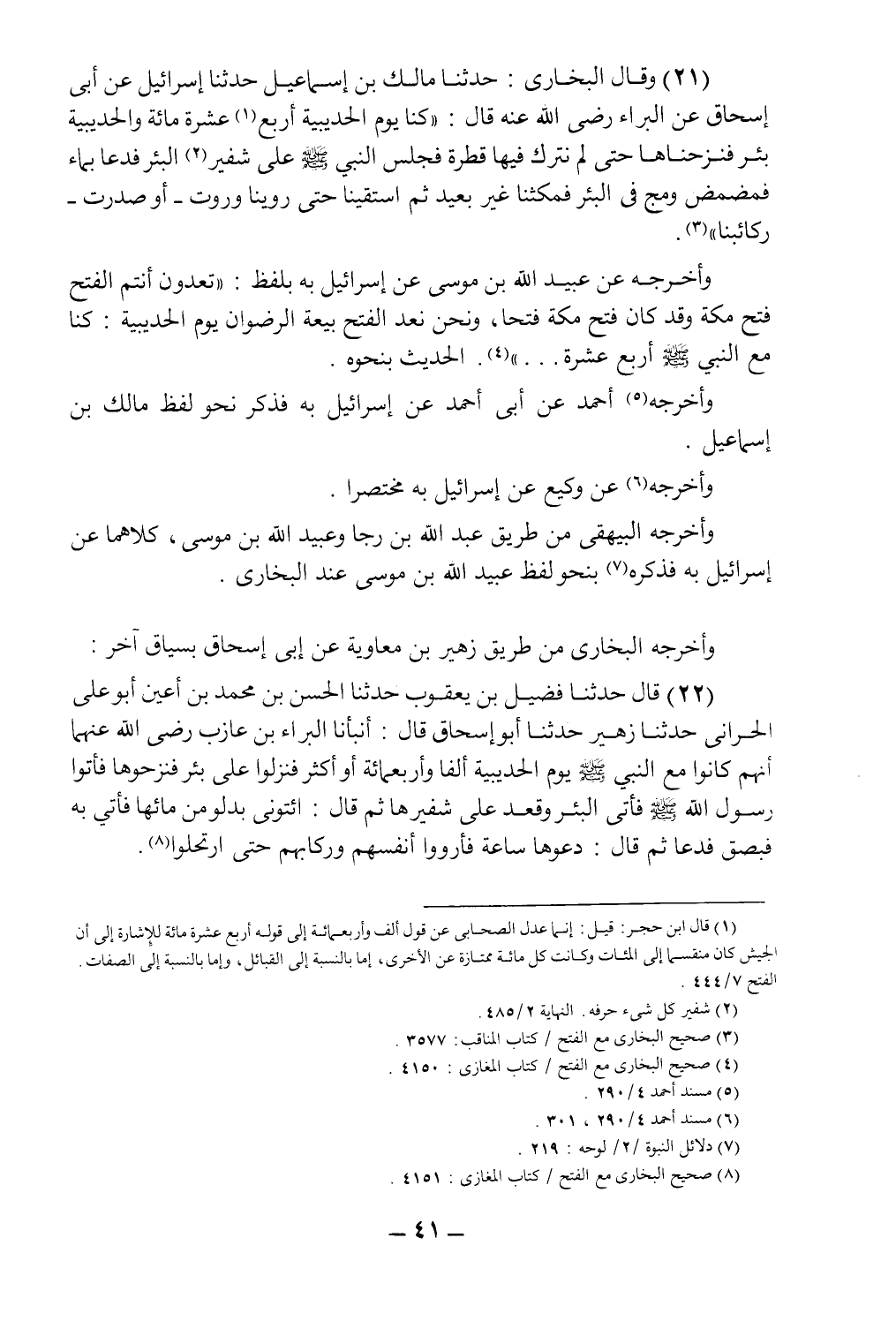 (21) وقال البخاري: حدثنا مالك بن إسماعيل حدثنا إسرائيل عن أبي إسحاق عن البراء رضي الله عنه قال: "كنا يوم الحديبية أربع1 عشر مائة، والحديبية بئر، فنزحناها حتى لن نترك فيها قطرة، فجلس النبي صلى الله عليه وسلم على شفير2 البئر، فدعا بماء فمضمض ومج في البئر فمكثنا غير بعيد ثم استقينا حتى روينا وروت - أو صدرت - ركائبنا"3.