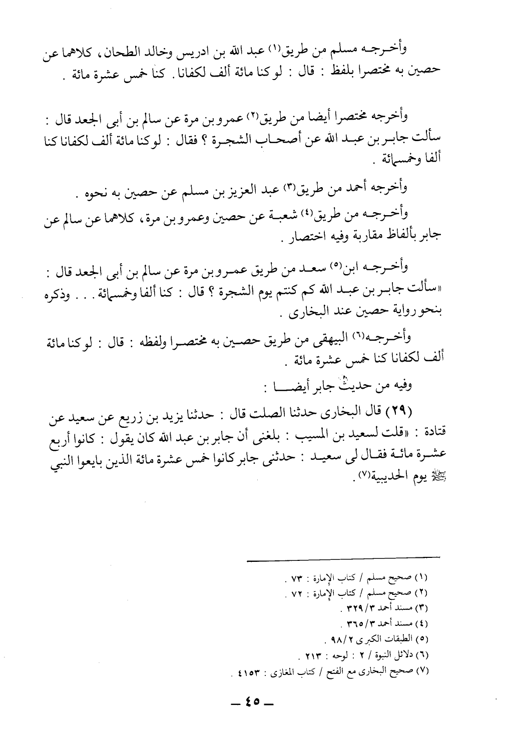 (29) قال البخاري حدثنا الصلت قال: حدثنا يزيد بن زريع عن سعيد عن قتادة: "قلت لسعيد بن المسيب: بلغني أن جابر بن عبد الله كان يقول: كانوا أربع عشرة مائة، فقال لي سعيد: حدثني جابر كانوا خمس عشرة مائة الذين بايعوا النبي صلى الله عليه وسلم يوم الحديبية7.