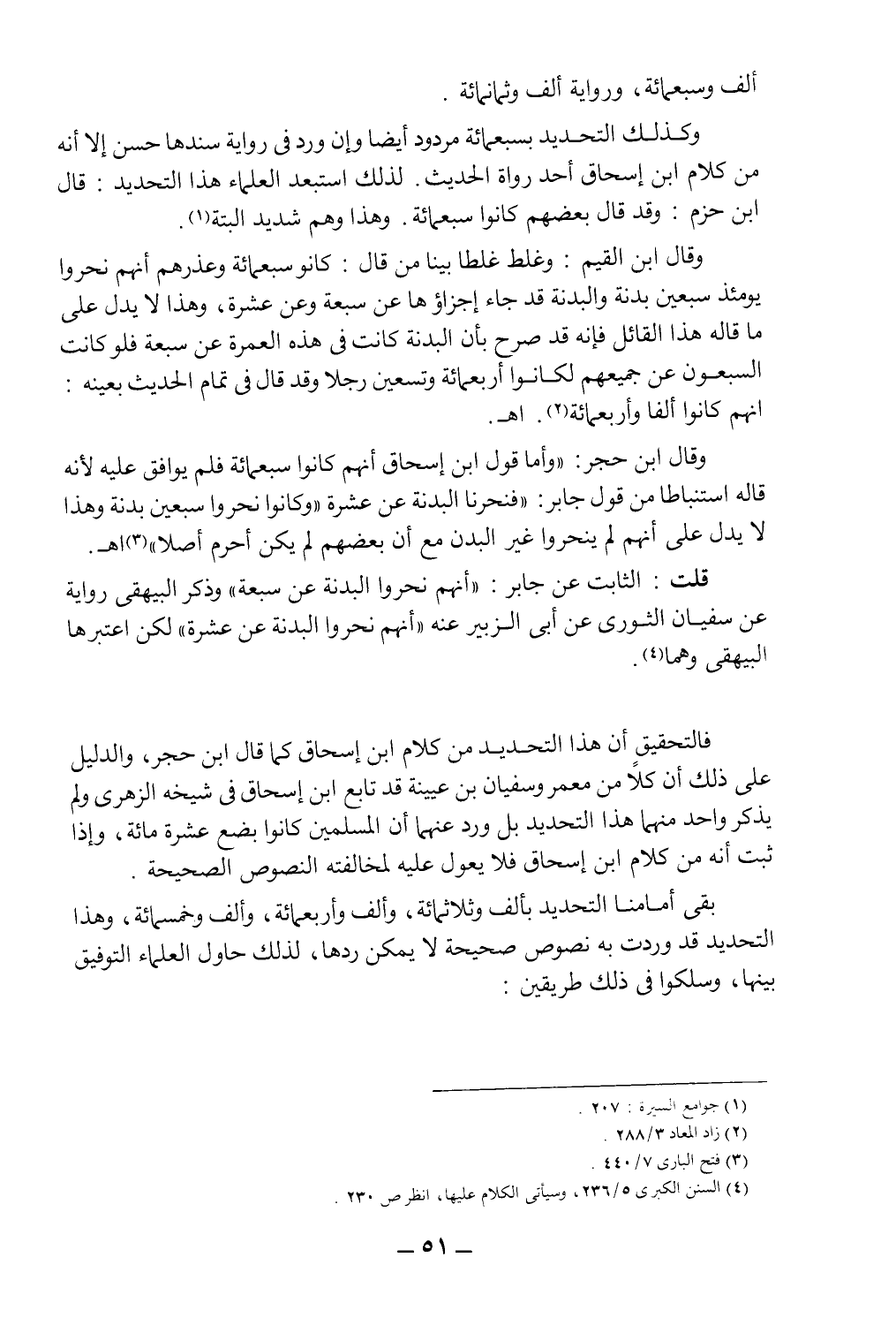 وقال ابن حجر: "وأما قول ابن إسحاق أنهم كانوا سبعمائة، فلم يوافق عليه، لأنه قاله استنباطاً من قول جابر: "فنحرنا البدنة عن عشرة "وكانوا نحروا سبعين بدنة، وهذا لا يدل على أنهم لم ينحروا غير البدن، مع أن بعضهم لم يكن أحرم أصلاً" ا. هـ3