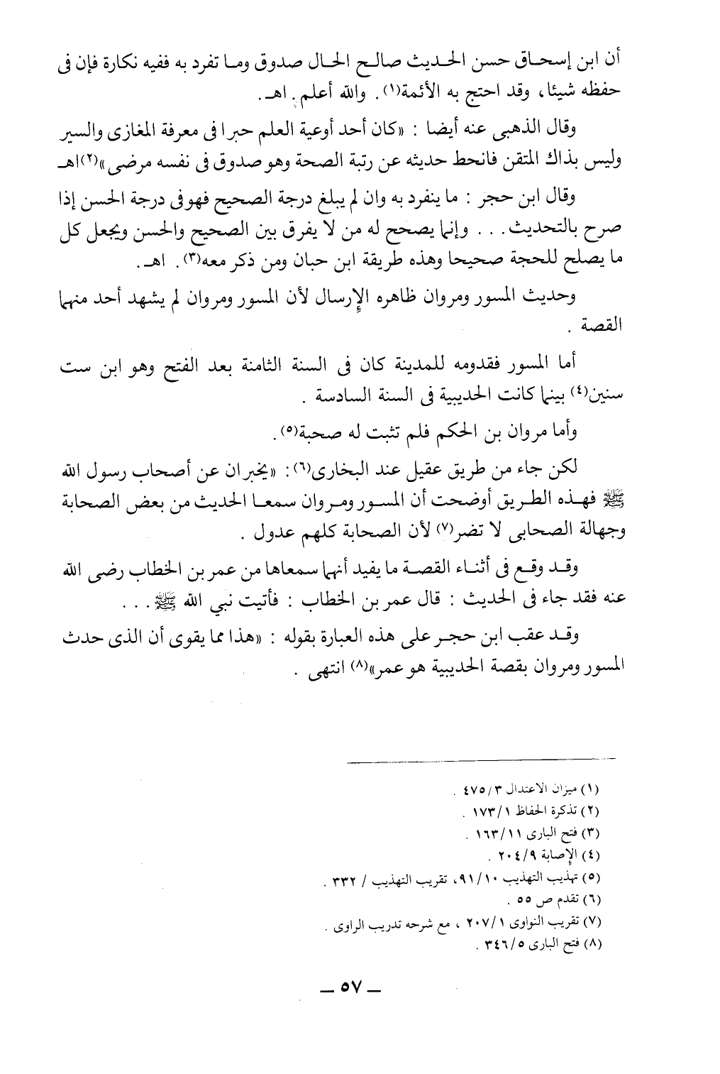 وقد عقب ابن حجر على هذه العبارة بقوله: "هذا مما يقوي أن الذي حدث المسور ومروان بقصة الحديبية، هو عمر"8 انتهى.