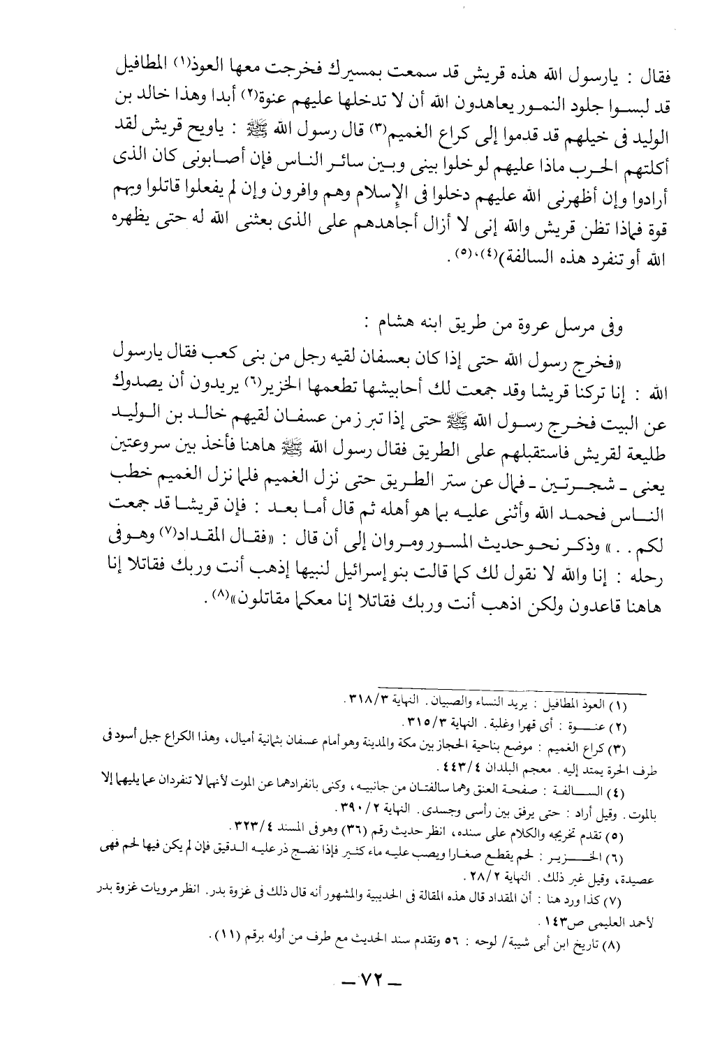 "فخرج رسول الله حتى إذا كان بعسفان لقيه رجل من بني كعب، فقال يا رسول الله: إنا تركنا قريشاًَ وقد جمعت لك أحابيشها تطعمها الخزير6 يريدون أن يصدوك عن البيت، فخرج رسول الله صلى الله عليه وسلم حتى إذا تبرز من عسفان لقيهم خالد بن الوليد طليعة لقريش فاستقبلهم على الطريق، فقال رسول الله صلى الله عليه وسلم هاهنا فأخذ بين سورعتين يعني - شجرتين - فمال عن ستر الطريق حتى نزل الغميم فلما نزل الغميم خطب الناس فحمد الله وأثنى عليه بما هو أهله ثم قال أما بعد: فإن قريشاً قد جمعت لكم ... " وذكر نحو حديث المسور ومروان إلى أن قال: "فقال المقداد7 وهو في رحله: إنا والله لا نقول لك كما قالت بنو إسرائيل لنبيها إذهب أنت وربك فقاتلا إنا هاهنا قاعدون، ولكن اذهب أنت وربك فقاتلا إنا معكما مقاتلون"8.