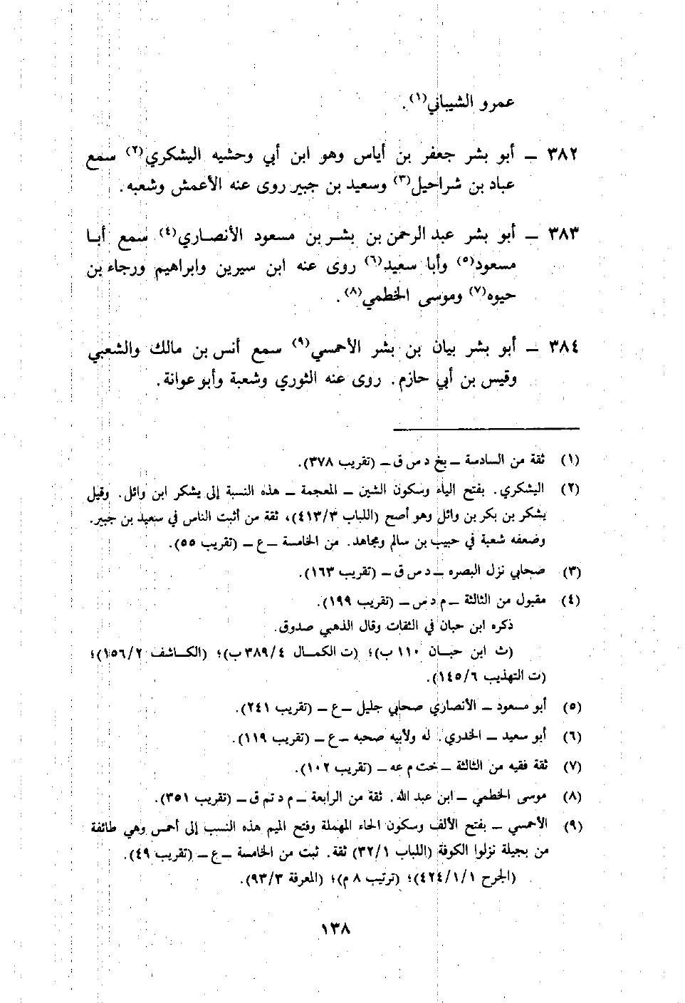 384- أبو بشر بيان بن بشر الأحمسي9 سمع أنس بن مالك والشعبي وقيس بن أبي حازم. روى عنه الثوري وشعبة وأبو عوانة.