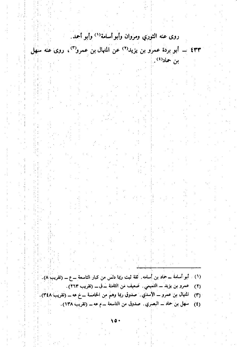 433- أبو بردة عمرو بن يزيد2 عن المنهال بن عمرو3 روى عنه سهل بن حماد4.