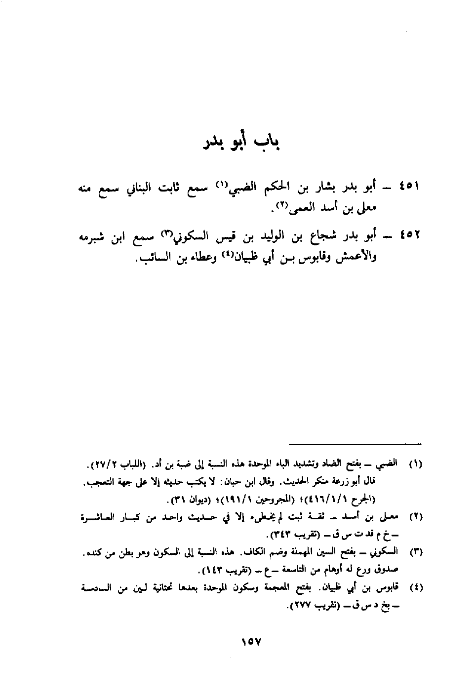 452- أبو بدر شجاع بن الوليد بن قيس السكوني3 سمع ابن شبرمة والأعمش وقابوس بن أبي ظبيان4 وعطاء بن السائب.
