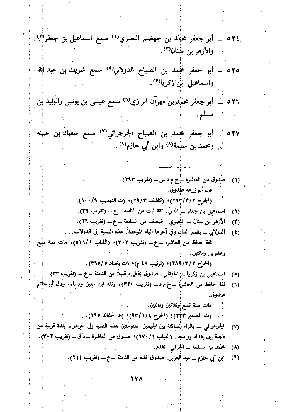 527- أبو جعفر محمد بن الصباح الجرجرائي7 سمع سفيان بن عيينة ومحمد بن سلمة8 وابن أبي حازم9.