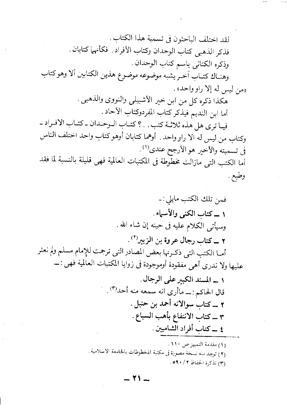 فيا ترى هل هذه ثلاثة كتب..؟ كتاب الوحدان- كتاب الافراد- وكتاب من ليس له إلا راو واحد. أوهما كتابان أو هو كتاب واحد اختلف الناس في تسميته والأخير هو الأرجح عندي"1.