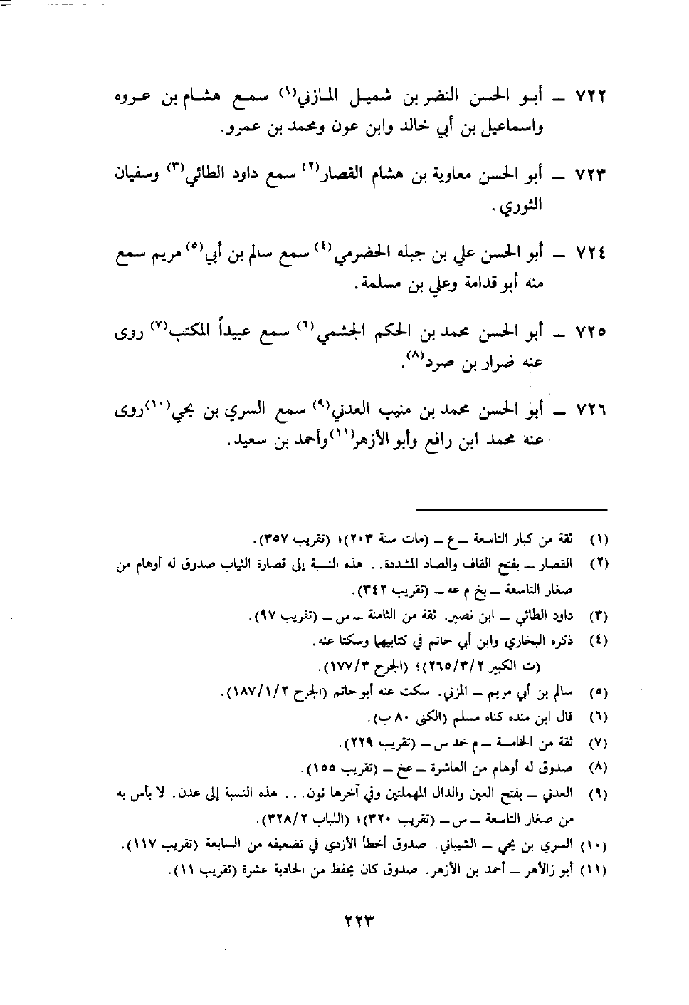 722- أبو الحسن النضر بن شميل المازني1 سمع هشام بن عروة وإسماعيل ابن أبي خالد وابن عون ومحمد بن عمرو.
