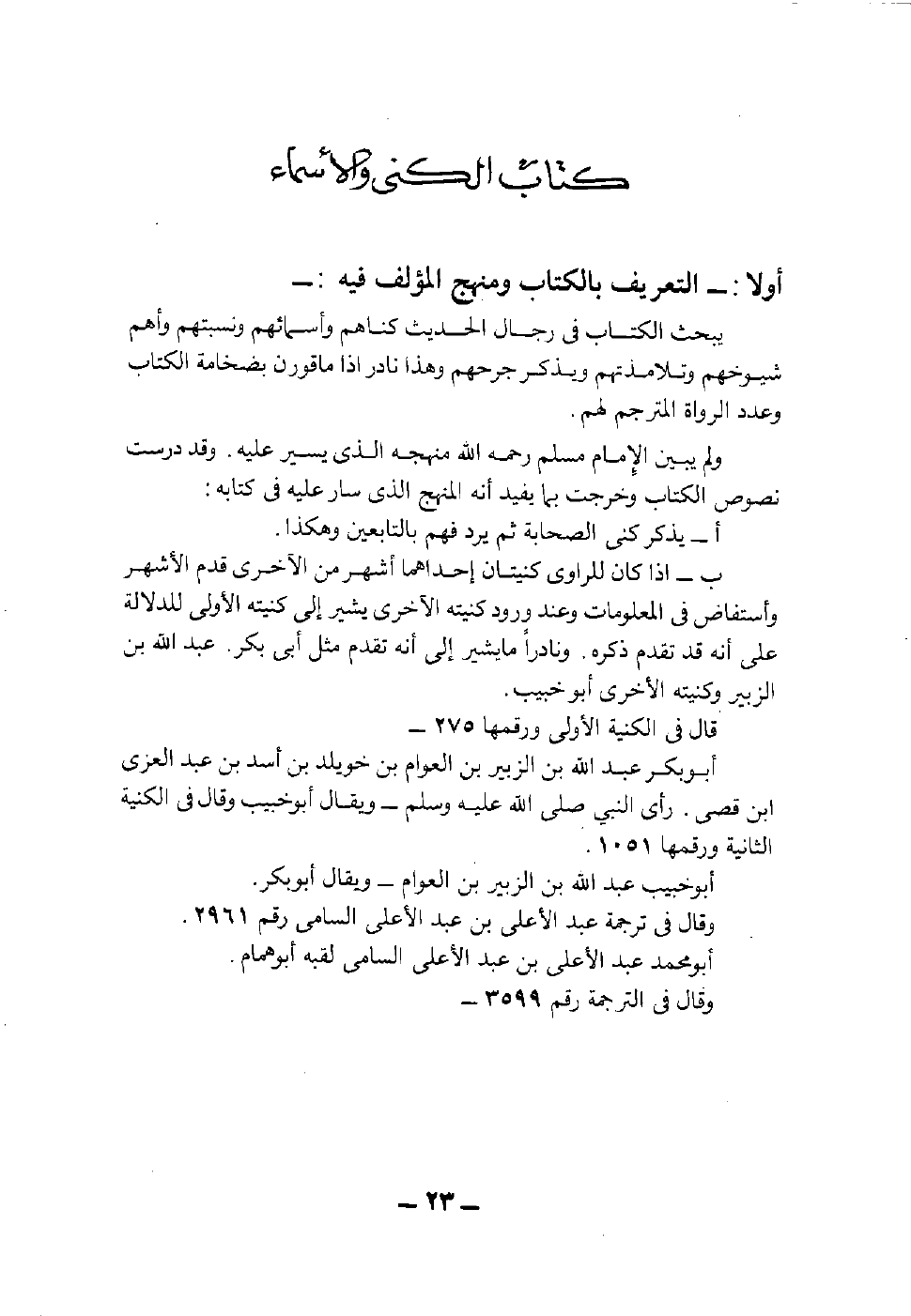 ب- إذا كان للراوي كنيتان إحداهما أشهر من الأخرى قدم الأشهر واستفاض في المعلومات وعند ورود كنيته الأخرى يشير إلى كنيته الأولى للدلالة على أنه قد تقدم ذكره. ونادرا ما يشير إلى أنه تقدم مثل أبي بكر. عبد الله بن الزبير وكنيته الأخرى أبو خبيب.