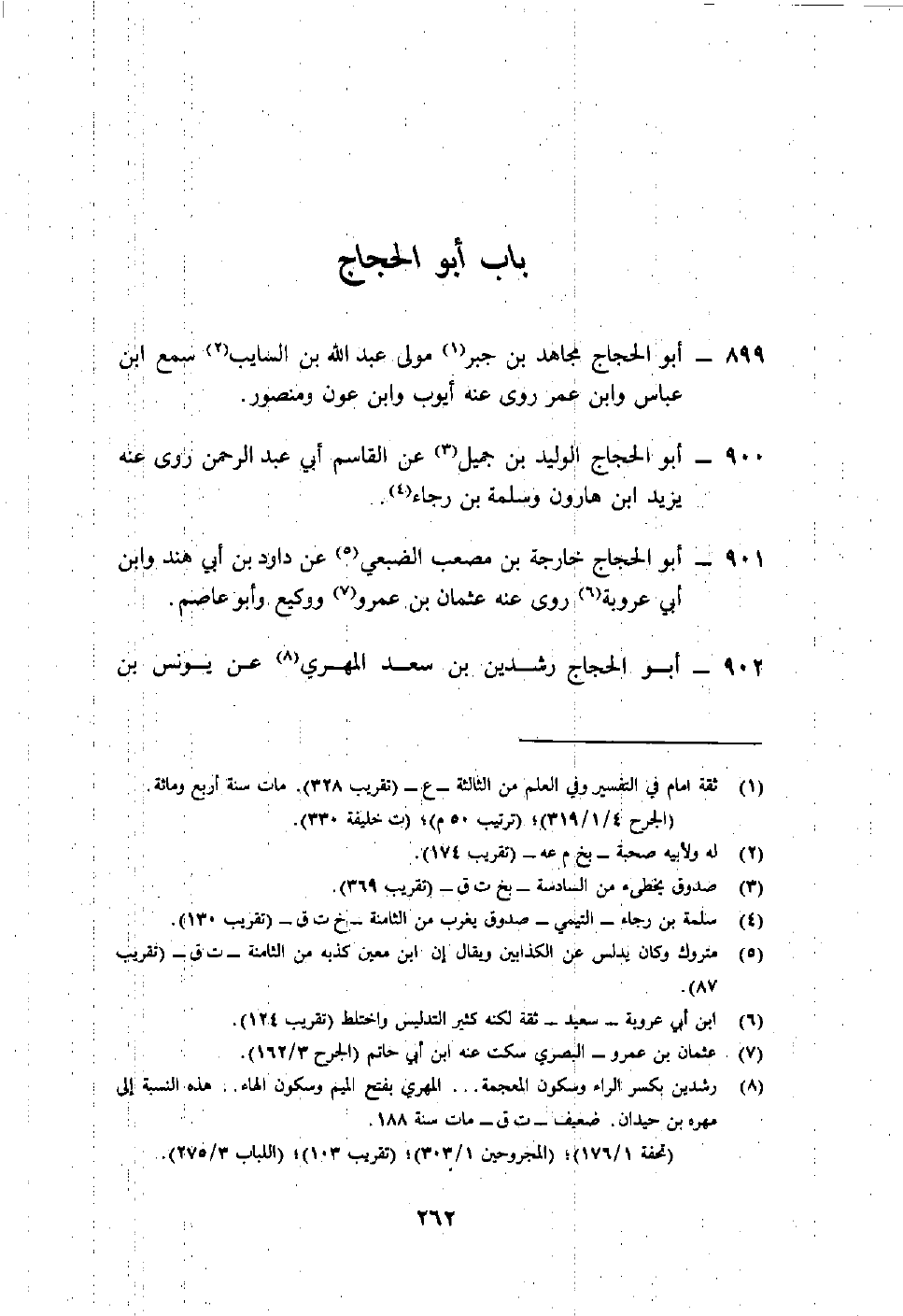 899- أبو الحجاج مجاهد بن جبر1 مولى عبد الله بن السايب2 سمع ابن عباس وابن عمر روى عنه أيوب وابن عون ومنصور.