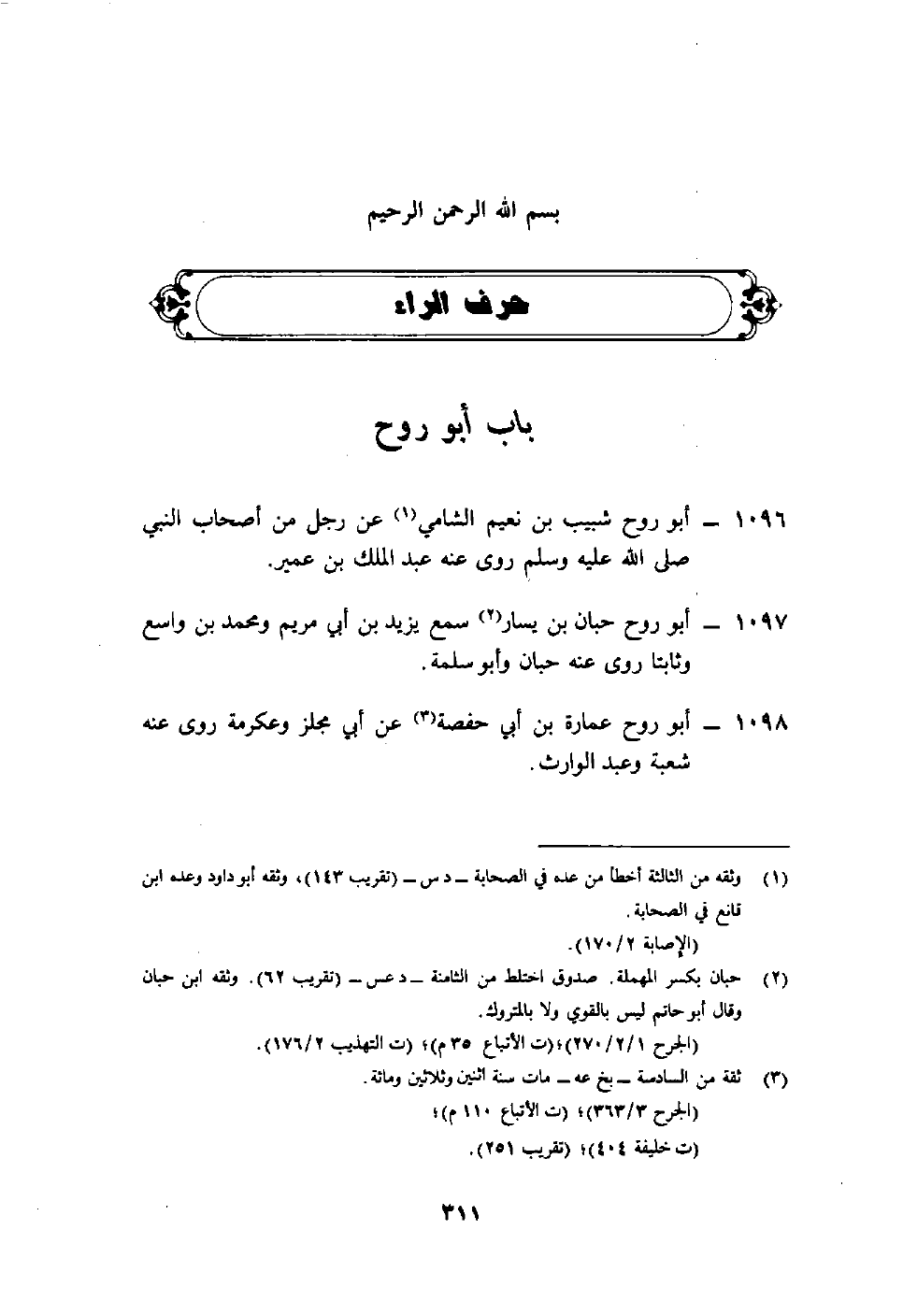 1097- أبو روح حبان بن يسار2 سمع يزيد بن أبي مريم ومحمد بن واسع وثابتا روى عنه حبان وأبو سلمة.
