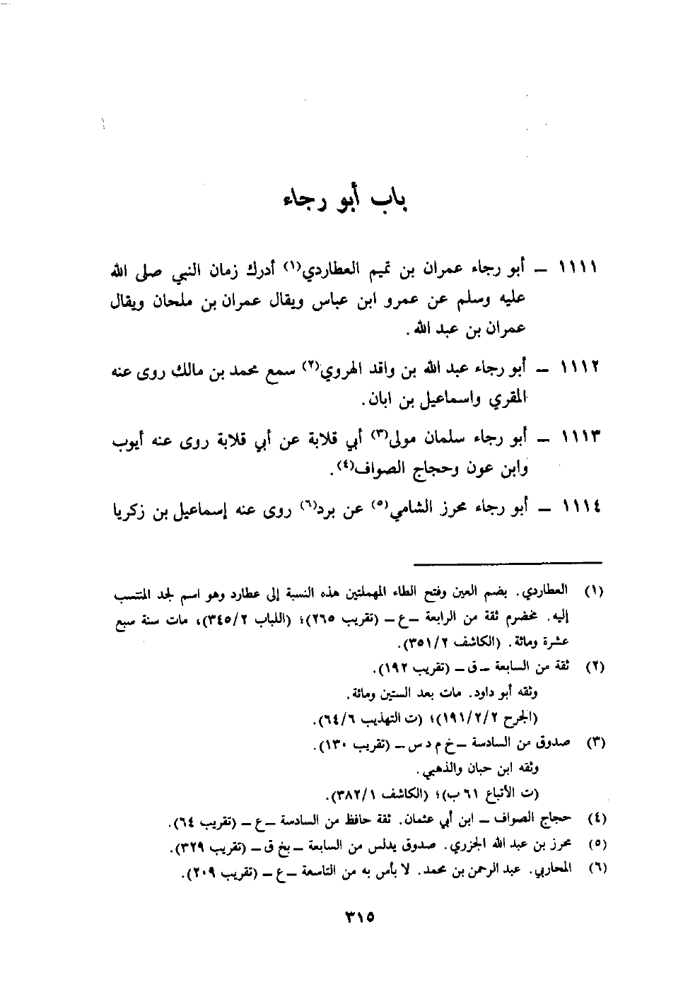 1111- أبو رجاء عمران بن تميم العطاردي1 أدرك زمان النبي صلى الله عليه وسلم عن عمرو ابن عباس ويقال عمران بن ملحان ويقال عمران بن عبد الله.