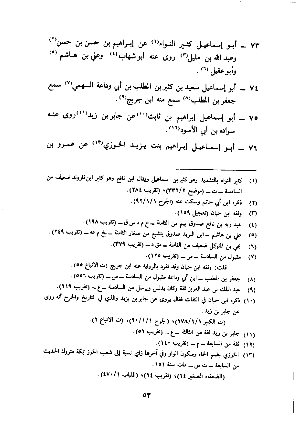 73- أبو إسماعيل كثير النواء1 عن إبراهيم بن حسن بن حسن2 وعبد الله بن مليل3 روى عنه أبو شهاب4 وعلي بن هاشم5 وأبو عقيل6.