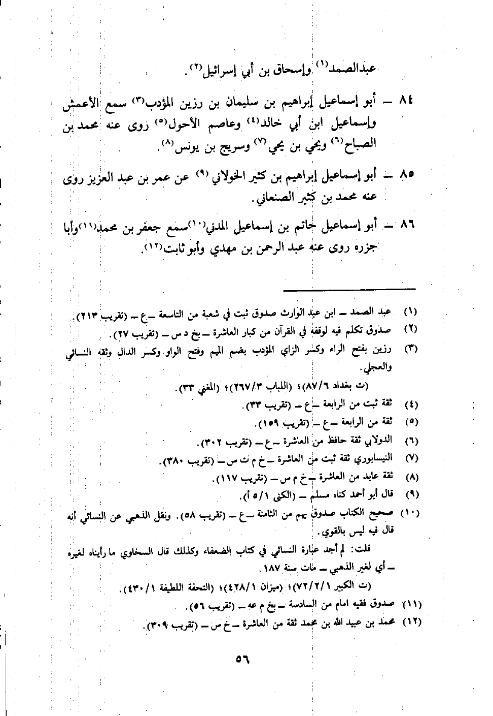86- أبو إسماعيل حاتم بن إسماعيل المدني 10سمع جعفر بن محمد11 وأبا جزره روى عنه عبد الرحمن بن مهدي وأبو ثابت12.