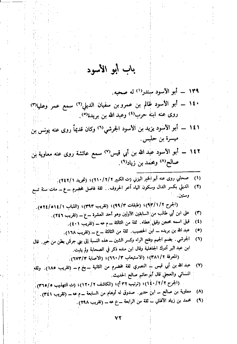 142- أبو الأسود عبد الله بن أبي قيس7 سمع عائشة روى عنه معاوية ابن صالح8 ومحمد بن زياد9.