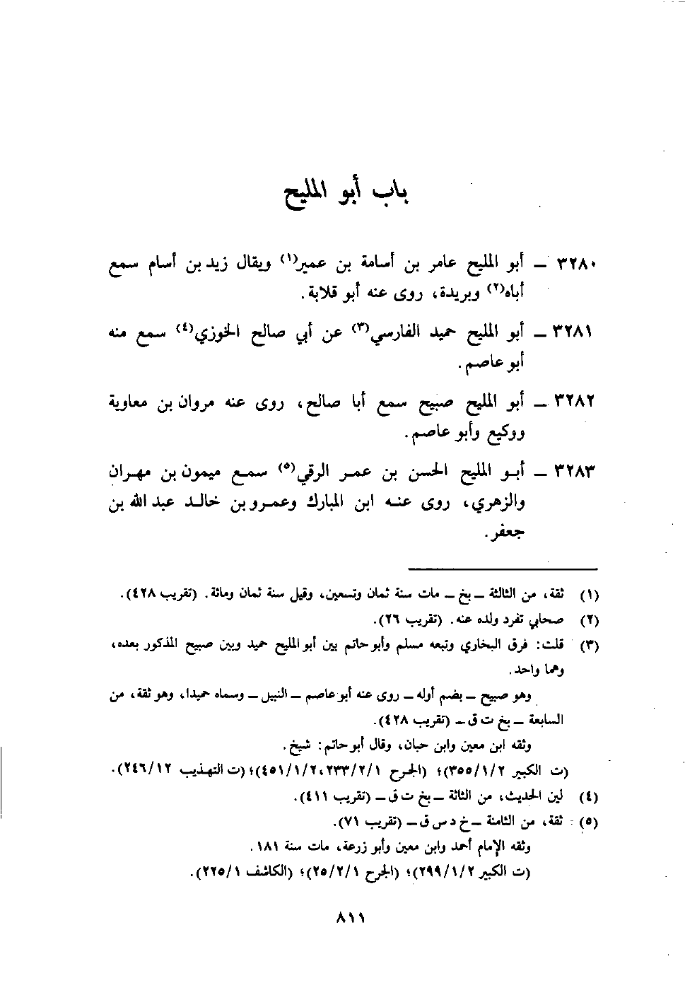 3 قلت: فرق البخاري وتبعه مسلم وأبو حاتم بين أبي المليح حميد وبين صبيح المذكور بعده، وهما واحد. وهو صبيح - بضم أوله - روى عنه أبو عاصم - النبيل - وسماه حميدا، وهو ثقة، من السابعة - بخ ت ق - (تقريب 428) . وثقه ابن معين وابن حبان، وقال أبو حاتم: شيخ. (ت الكبير 2/1/355) ؛ (الجرح 1/2/233، 2/1/451) ؛ (ت التهذيب 12/246) .