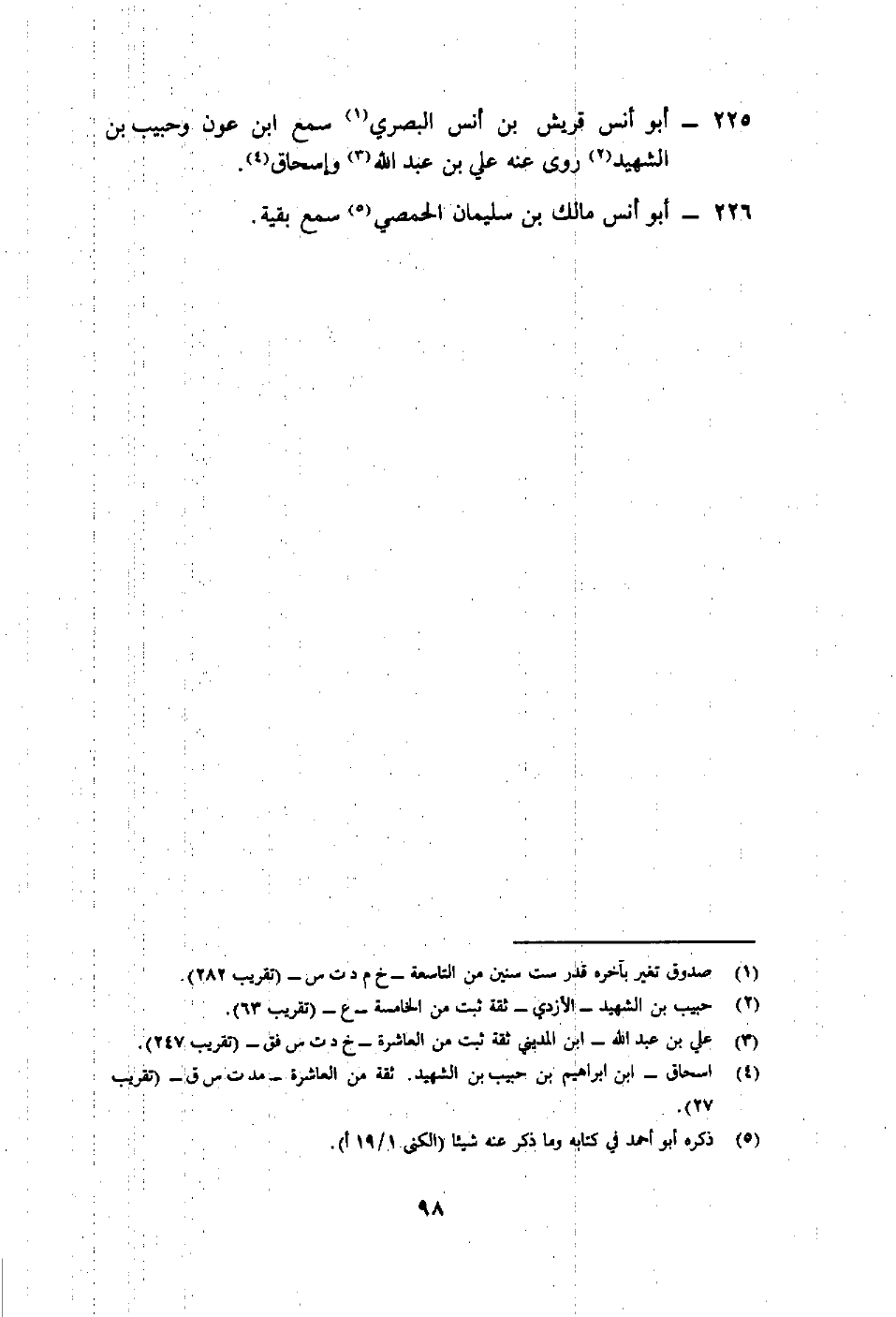 225- أبو أنس قريش بن أنس البصري1 سمع ابن عون وحبيب ابن الشهيد2 روى عنه علي بن عبد الله3 إسحاق4.