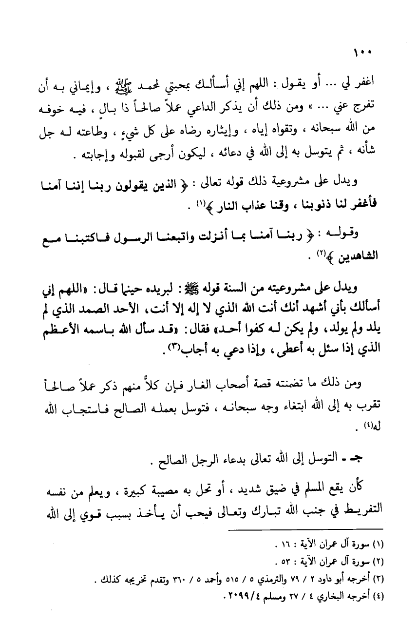 اغفر لي ... أو يقول: اللهم إني أسألك بمحبتي لمحمد - صلى الله عليه وسلم -، وإيماني به أن تفرج عني ... " ومن ذلك أن يذكر الداعي عملاً صالحاً ذا بالٍ، فيه خوفه من الله سبحانه، وتقواه إياه، وإيثاره رضاه على كل شيء، وطاعته له جل شأنه، ثم يتوسل به إلى الله في دعائه، ليكون أرجى لقبوله وإجابته.