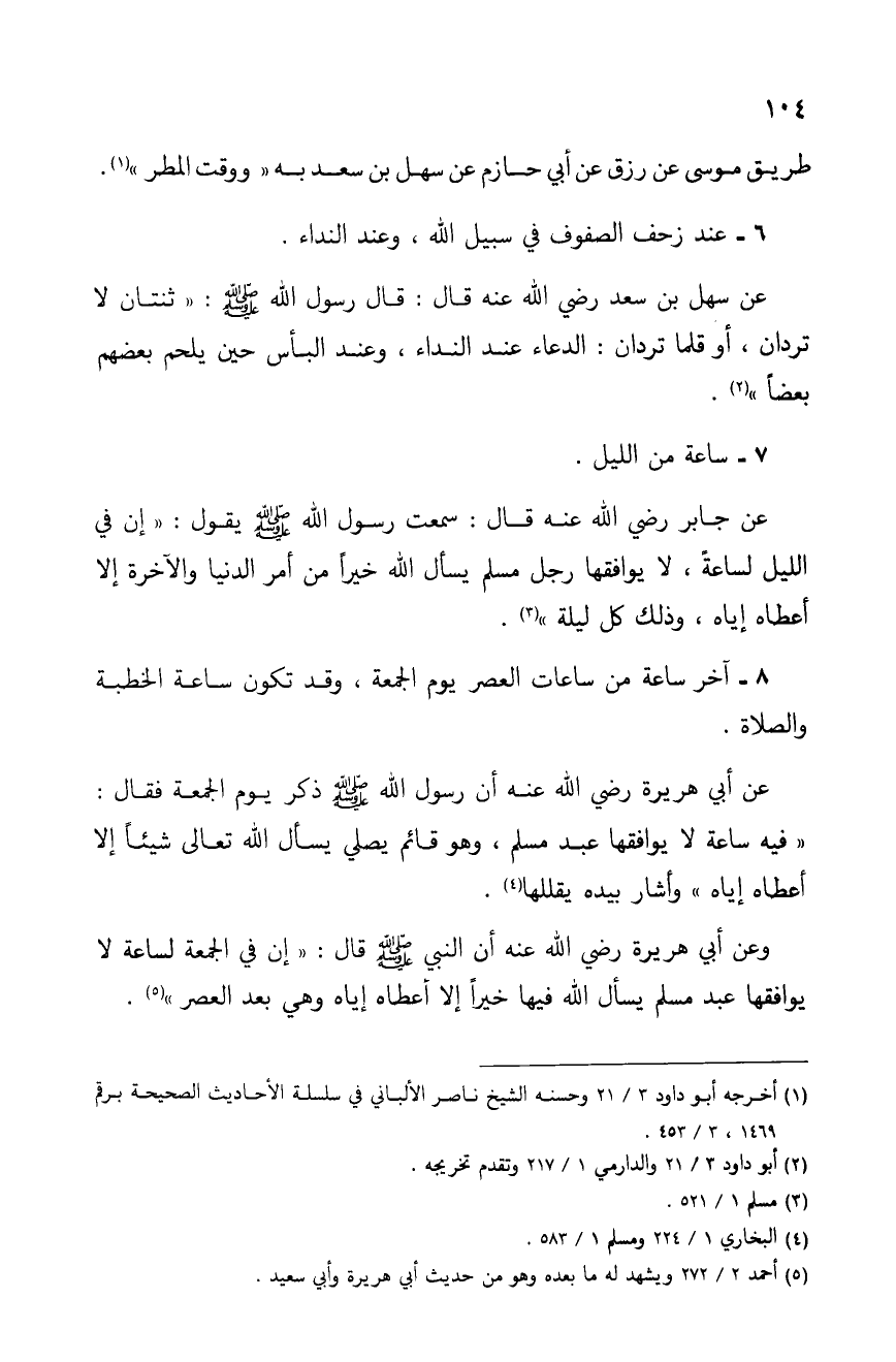 عن جابر رضي الله عنه قال: سمعت رسول الله - صلى الله عليه وسلم - يقول: "إن في الليل لساعةً، لا يوافقها رجل مسلم يسأل الله خيرًا من أمر الدنيا والآخرة إلا أعطاه إياه، وذلك كل ليلة" (¬3).
