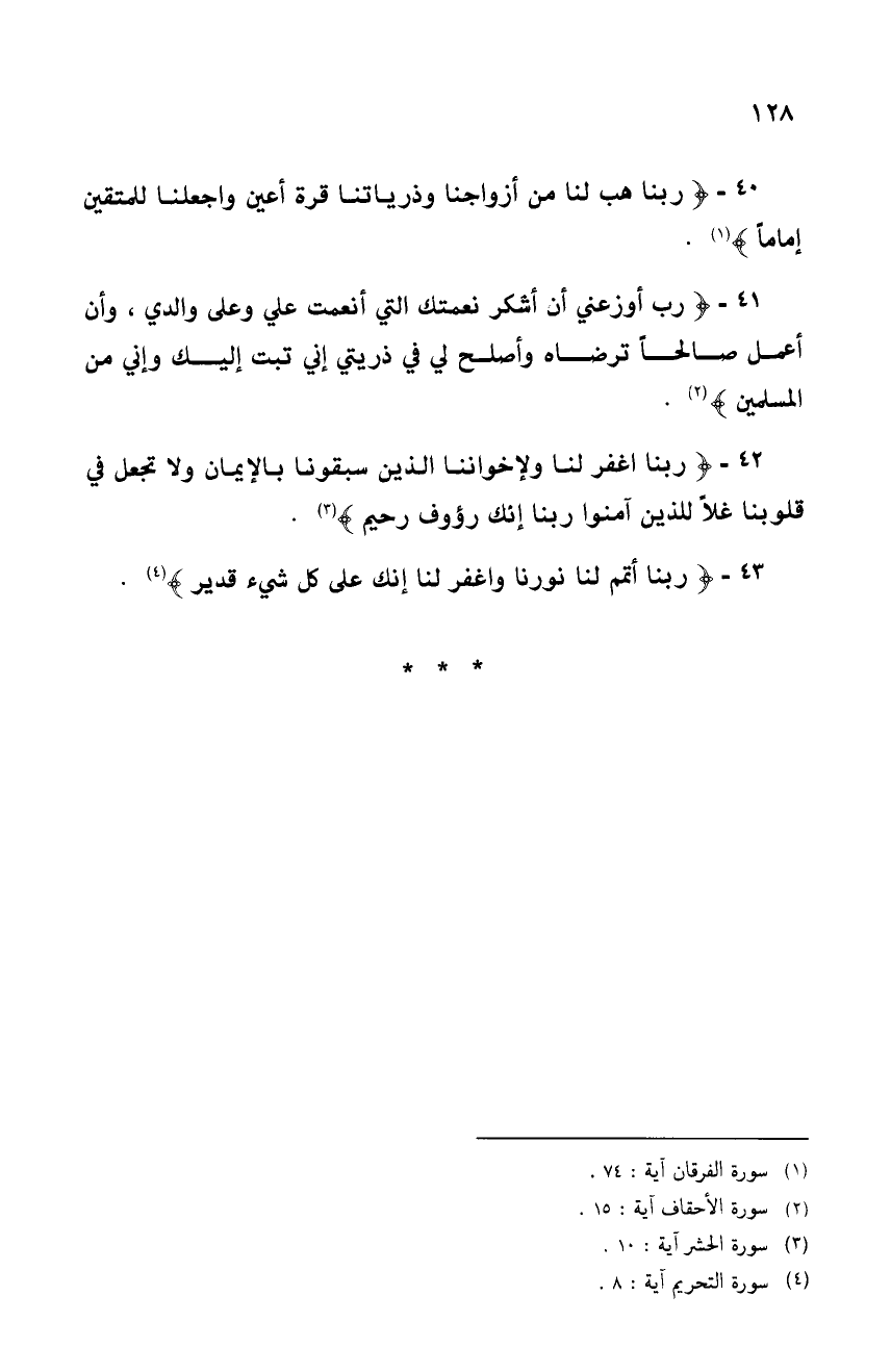 40 - {رَبَّنَا هَبْ لَنَا مِنْ أَزْوَاجِنَا وَذُرِّيَّاتِنَا قُرَّةَ أَعْيُنٍ وَاجْعَلْنَا لِلْمُتَّقِينَ إِمَامًا (74)} (¬1).