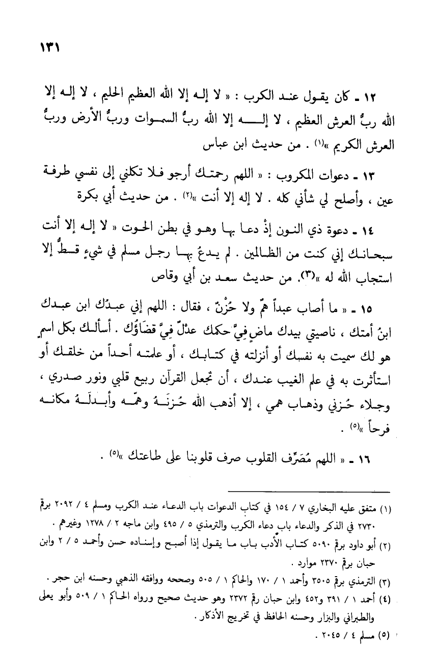 (¬1) متفق عليه البخاري 7/ 154 في كتاب الدعوات باب الدعاء عند الكرب ومسلم 4/ 2092 برقم 2730 في الذكر والدعاء باب دعاء الكرب والترمذي 5/ 495 وابن ماجه 2/ 1278 وغيرهم.