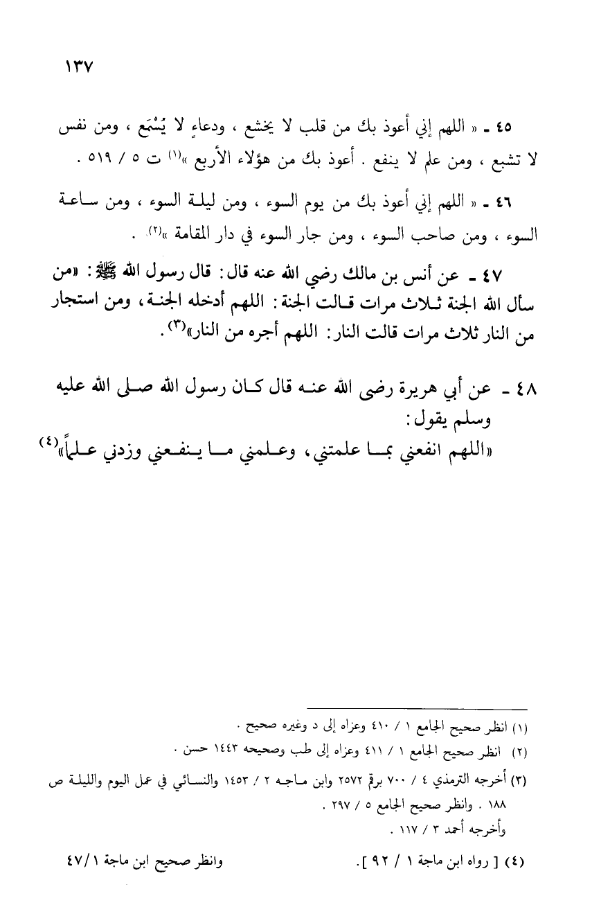 45 - "اللهم إني أعوذ بك من قلب لا يخشع، ودعاءٍ لا يُسْمَع، ومن نفس لا تشبع، ومن علم لا ينفع. أعوذ بك من هؤلاء الأربع" (¬1) ت 5/ 519.