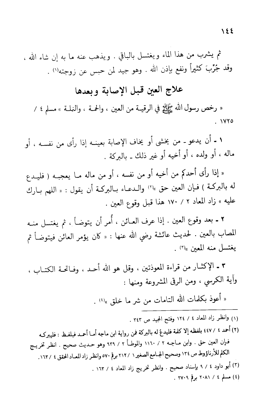 "إذا رأى أحدكم من أخيه أو من نفسه، أو من ماله ما يعجبه (فليدع له بالبركة) فإن العين حق" (¬2) والدعاء بالبركة أن يقول: "اللهم بارك عليه" زاد المعاد 2/ 170 هذا قبل وقوع العين.
