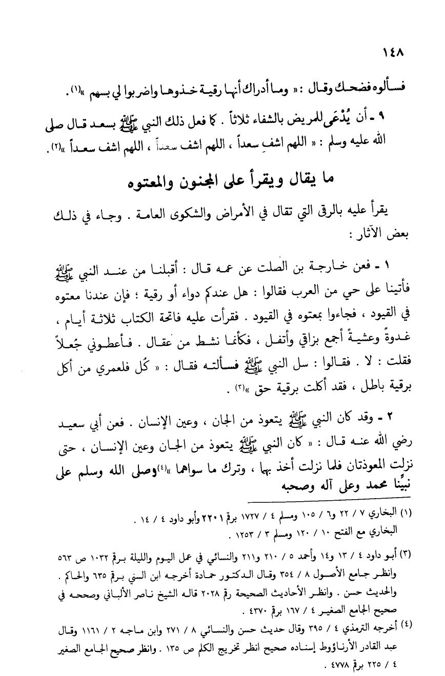 1 - فعن خارجة بن الصلت عن عمه قال: أقبلنا من عند النبي - صلى الله عليه وسلم - فأتينا على حي من العرب فقالوا: هل عندكم دواء أو رقية؛ فإن عندنا معتوه في القيود، فجاءوا بمعتوه في القيود. فقرأت عليه فاتحة الكتاب ثلاثة أيام، غدوةً وعشيةً أجمع بزاقي وأتفل، فكأنما نشط من عقال. فأعطوني جُعلاً فقلت: لا, فقالوا: سل النبي - صلى الله عليه وسلم - فسألته فقال: "كُل فلعمري من أكل برقية باطل، فقد أكلت برقية حق" (¬3).