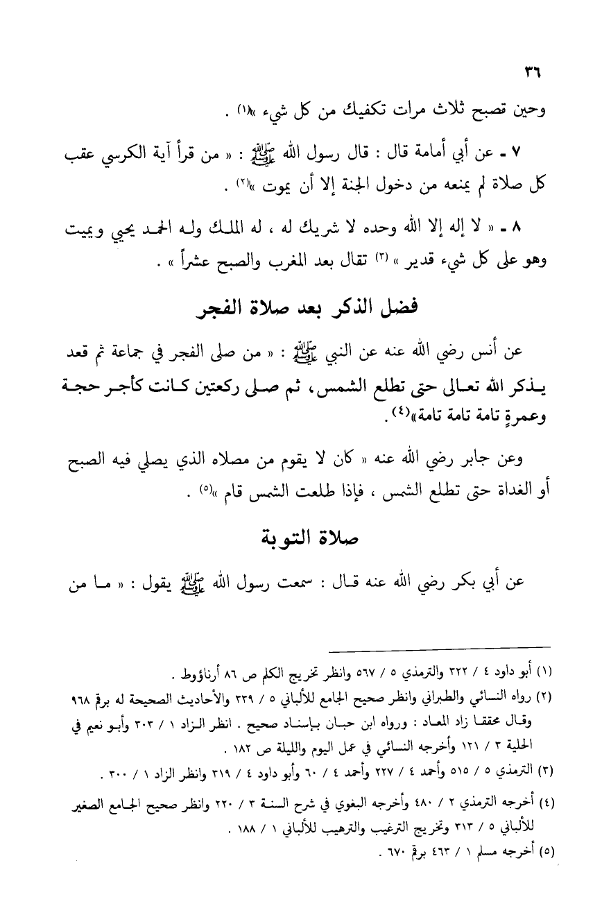 (¬2) رواه النسائي والطبراني وانظر صحيح الجامع للألباني 5/ 339 والأحاديث الصحيحة له برقم 968 وقال محققا زاد المعاد: ورواه ابن حبان بإسناد صحيح. انظر الزاد 1/ 303 وأبو نعيم في الحلية 3/ 121 وأخرجه النسائي في كل اليوم والليلة ص 182.