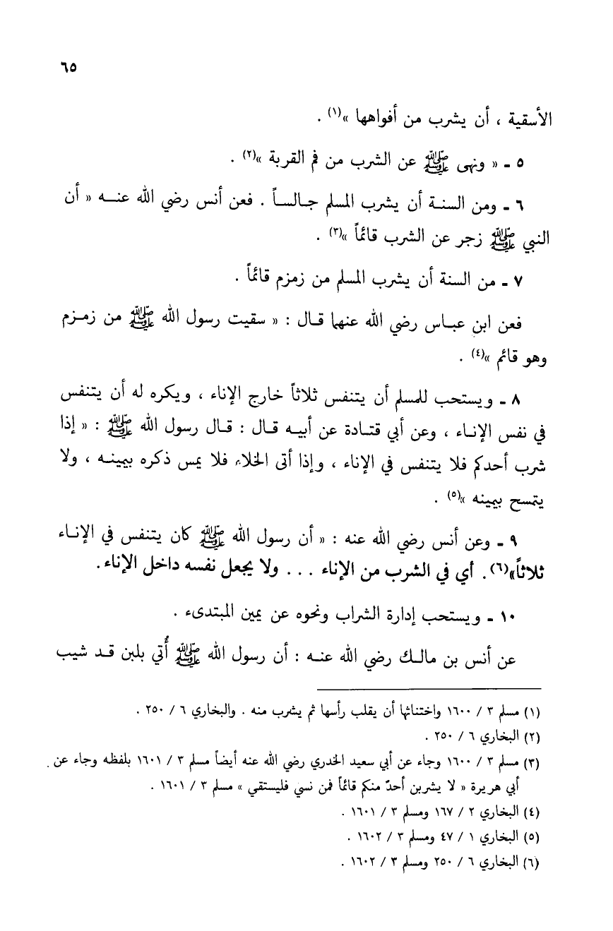 6 - ومن السنة أن يشرب المسلم جالساً. فعن أنس رضى الله عنه "أن النبي - صلى الله عليه وسلم - زجر عن الشرب قائماً" (¬3).