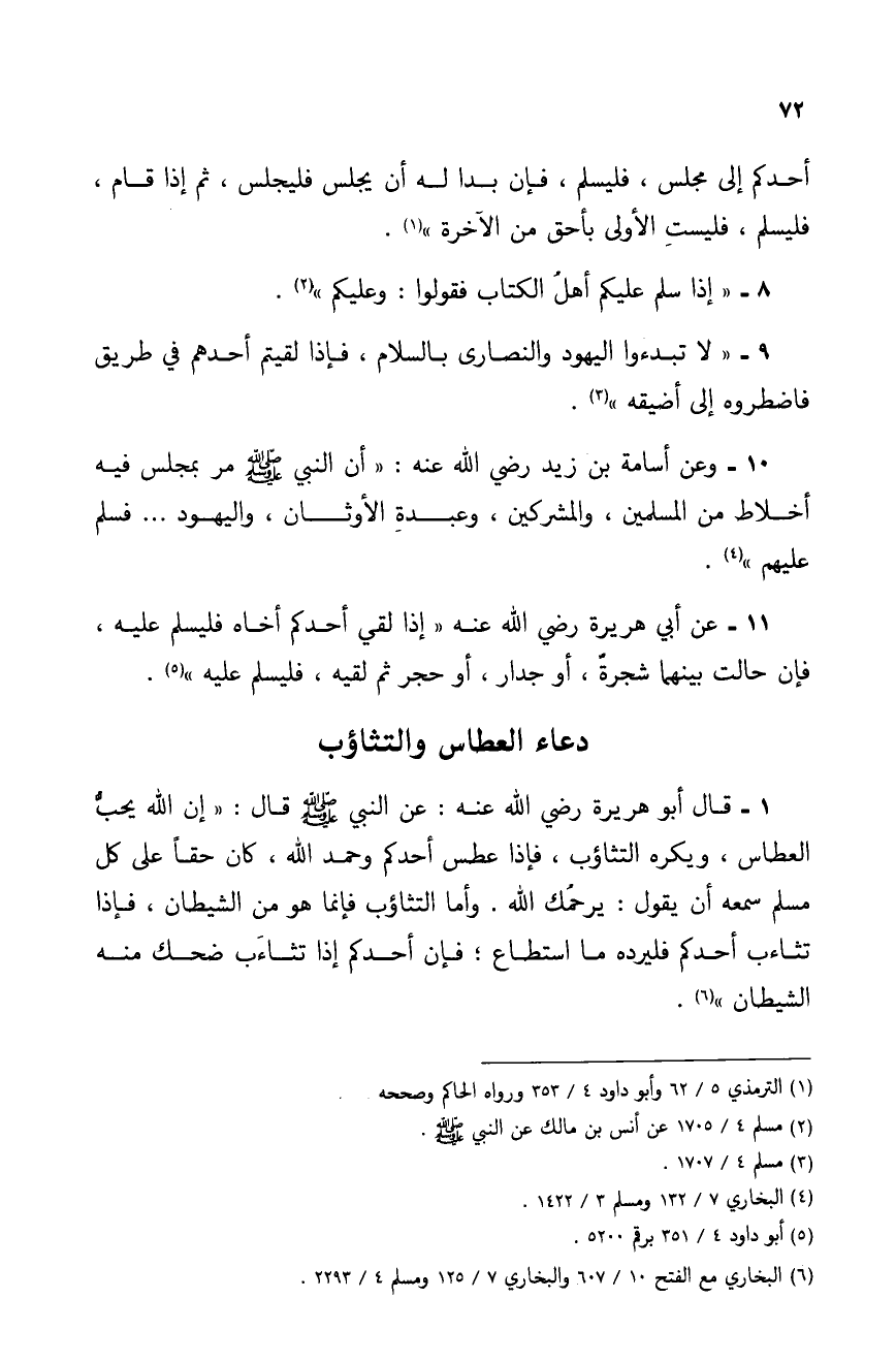 11 - عن أبي هريرة رضي الله عنه "إذا لقي أحدكم أخاه فليسلم عليه، فإن حالت بينهما شجرة، أو جدار، أو حجر ثم لقيه، فليسلم عليه" (¬5).