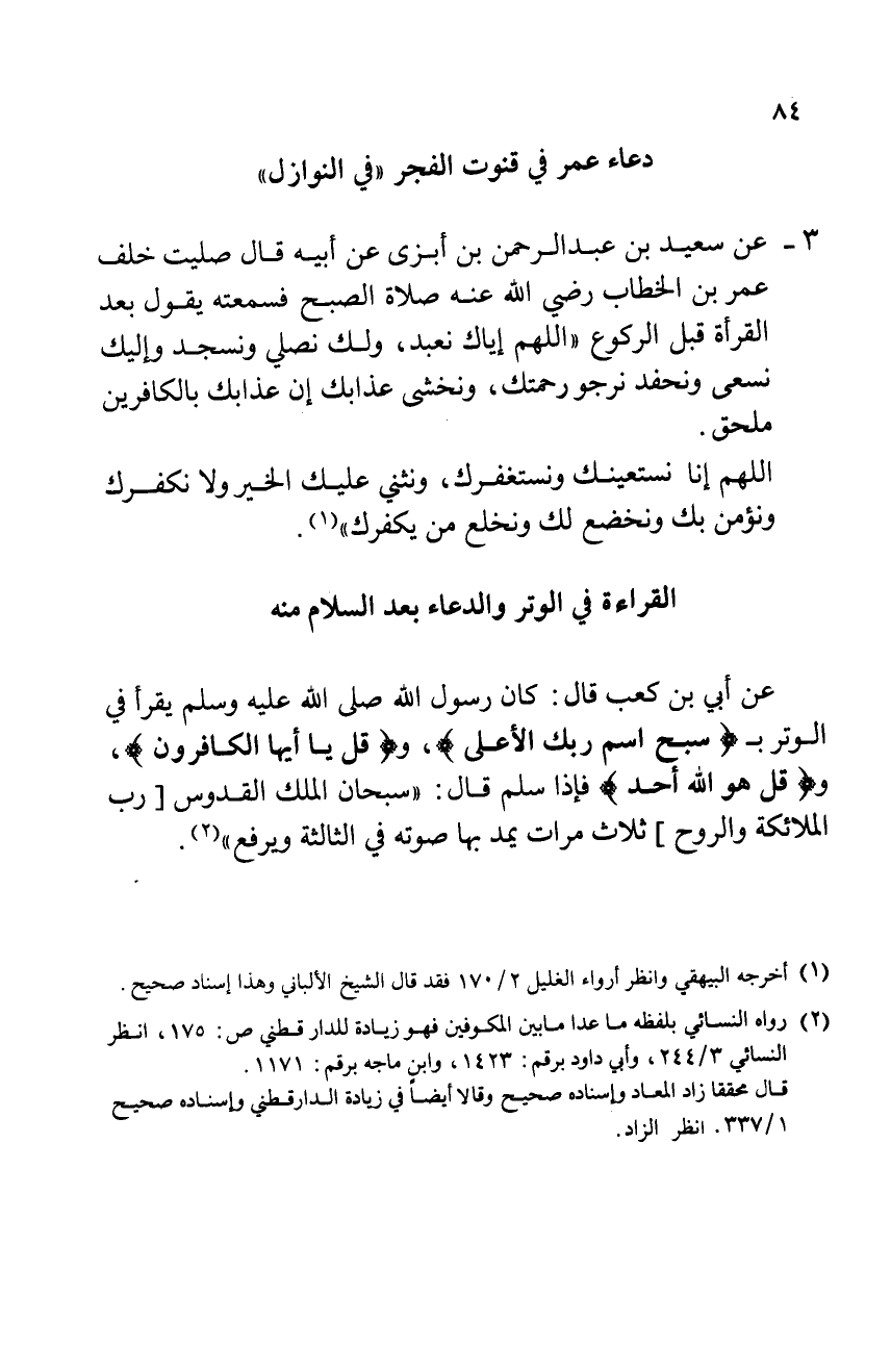 3 - عن سعيد بن عبد الرحمن بن أبزى عن أبيه قال صليت خلف عمر بن الخطاب رضي الله عنه صلاة الصبح فسمعته يقول بعد القراءة قبل الركوع "اللهم إياك نعبد، ولك نصلي ونسجد وإليك نسعى ونحفد نرجو رحمتك، ونخشى عذابك إن عذابك بالكافرين ملحق.