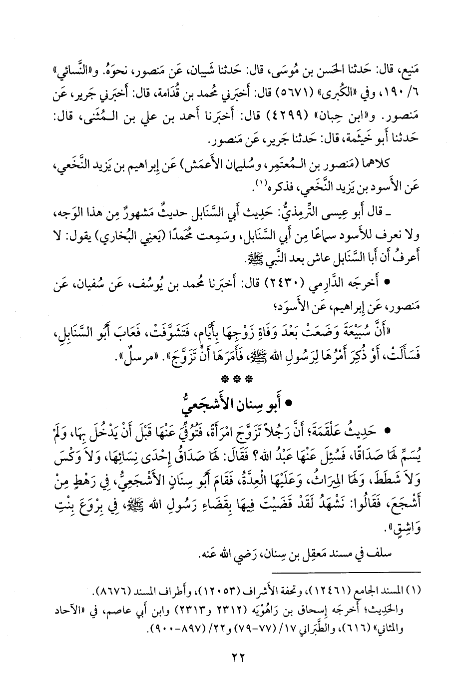- قال أبو نُعيم: أبو سنان الأشجعي، شَهِد قضاء رسول الله صَلى الله عَليه وسَلم في بِروَع بنت واشِق، حديثه عند علقمة، وعبد الله بن عُتبة بن مسعود، يُعَدُّ في المدنيين. «معرفة الصحابة» لأبي نُعيم (٣٢٤٦).