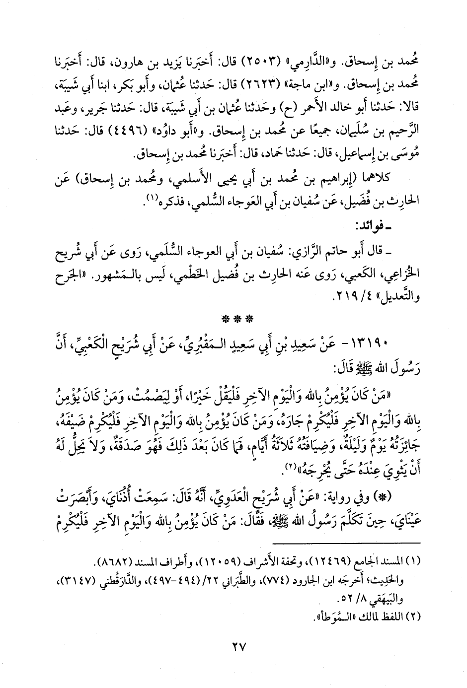 - وفي رواية: «عن أبي شريح العدوي، أنه قال: سمعت أذناي، وأبصرت عيناي، حين تكلم رسول الله صَلى الله عَليه وسَلم فقال: من كان يؤمن بالله واليوم الآخر فليكرم