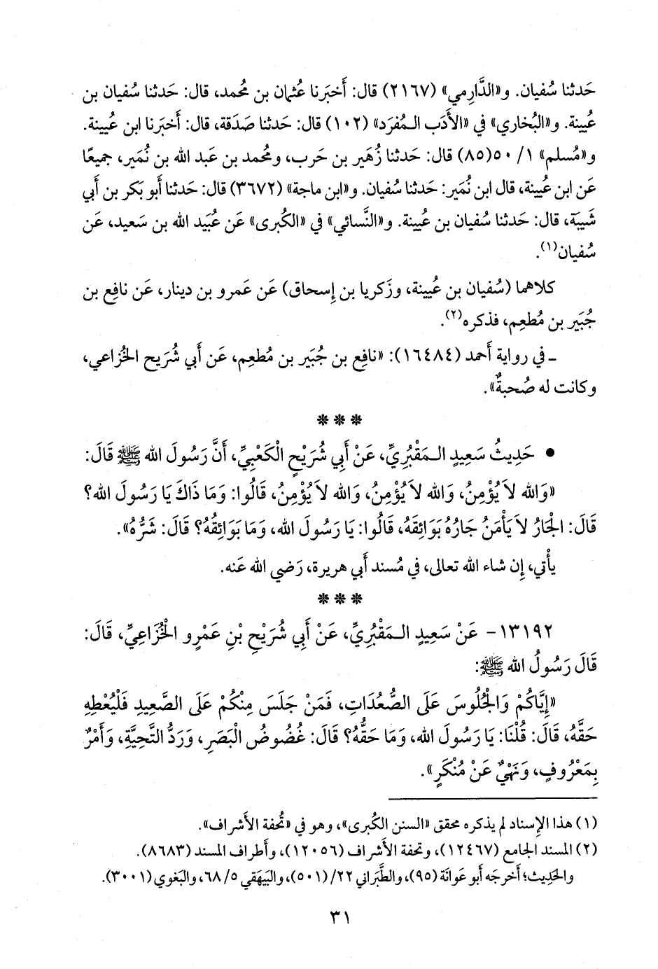 ١٣١٩٢ - عن سعيد المَقبُري، عن أبي شريح بن عَمرو الخُزاعي، قال: قال رسول الله صَلى الله عَليه وسَلم: