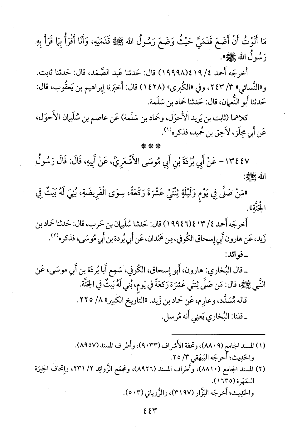 - قلنا: إِسناده ضعيفٌ؛ قال البخاري: هارون، أَبو إسحاق، الكوفي، سمع أبا بردة بن أبي موسى، عن النبي صَلى الله عَليه وسَلم قال: من صلى ثنتي عشرة ركعة في يوم، بني له بيت في الجنة.