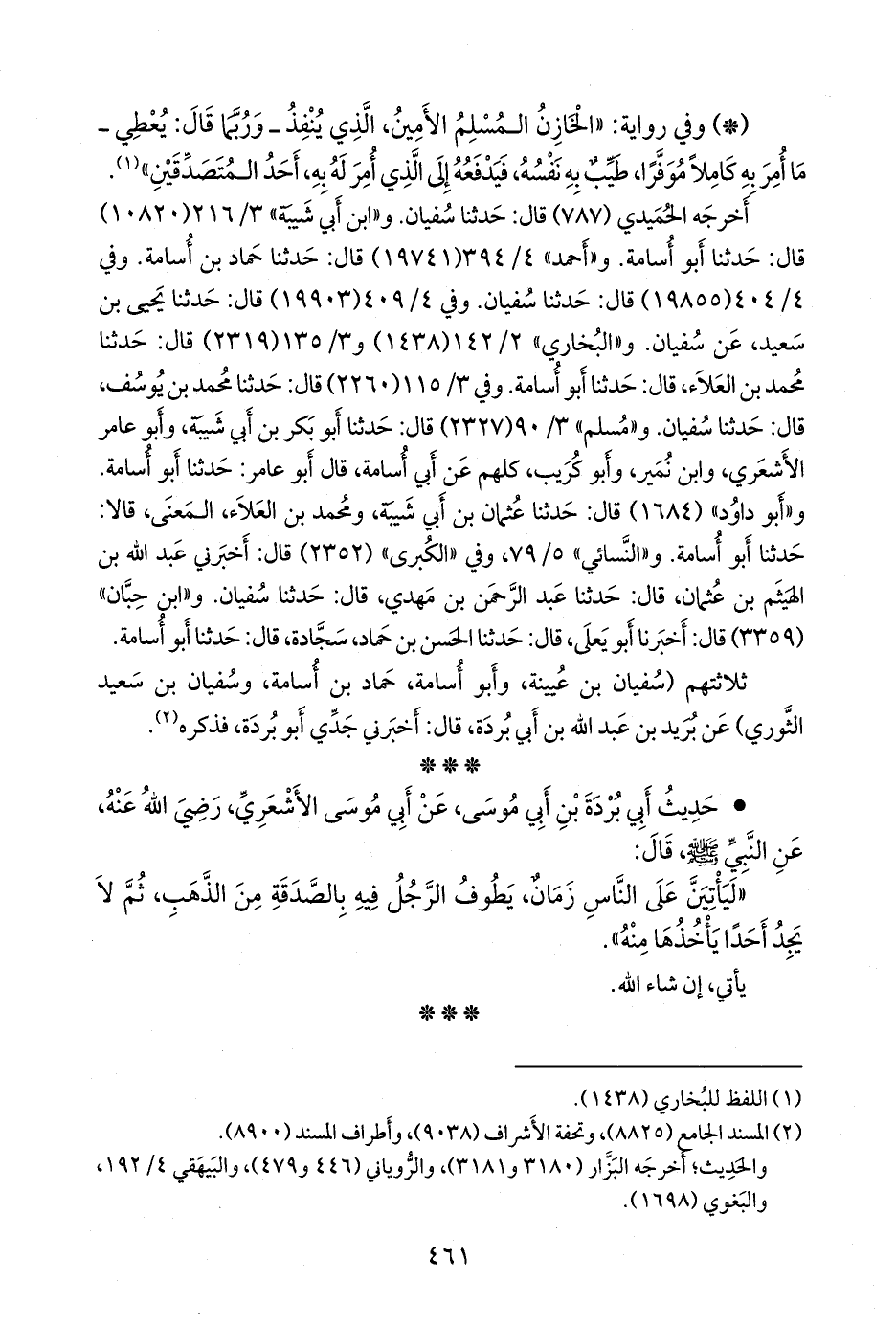 وفي ٤/ ٤٠٩ (١٩٩٠٣) قال: حدثنا يحيى بن سعيد، عن سفيان. و «البخاري» ٢/ ١١٤ (١٤٣٨) و ٣/ ١٠٣ (٢٣١٩) قال: حدثنا محمد بن العلاء، قال: حدثنا أَبو أُسامة. وفي ٣/ ٨٨ (٢٢٦٠) قال: حدثنا محمد بن يوسف، قال: حدثنا سفيان. و «مسلم» ٣/ ٩٠ (٢٣٢٧) قال: حدثنا أَبو بكر بن أبي شيبة، وأَبو عامر الأشعري، وابن نُمير، وأَبو كُريب، كلهم عن أبي أُسامة، قال أَبو عامر: حدثنا أَبو أُسامة. و «أَبو داود» (١٦٨٤) قال: حدثنا عثمان بن أبي شيبة، ومحمد بن العلاء، المَعنَى، قالا: حدثنا أَبو أُسامة. و «النَّسَائي» ٥/ ٧٩، وفي «الكبرى» (٢٣٥٢) قال: أخبرني عبد الله بن الهيثم بن عثمان، قال: حدثنا عبد الرَّحمَن بن مهدي، قال: حدثنا سفيان. و «ابن حِبَّان» (٣٣٥٩) قال: أخبرنا أَبو يَعلى، قال: حدثنا الحسن بن حماد، سجادة، قال: حدثنا أَبو أُسامة.