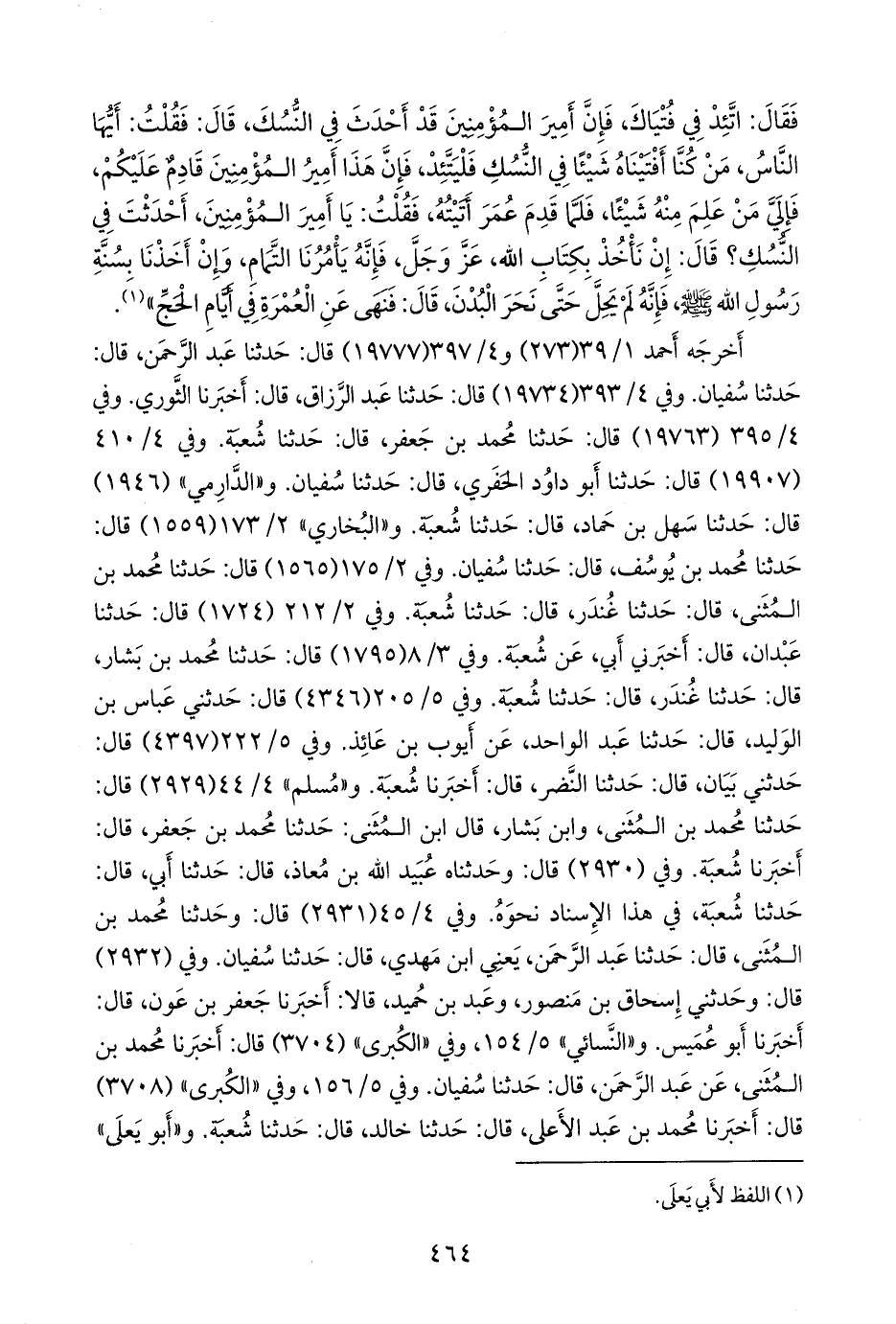 وفي ٣/ ٦ (١٧٩٥) قال: حدثنا محمد بن بشار، قال: حدثنا غُندَر، قال: حدثنا شعبة. وفي ٥/ ١٦٢ (٤٣٤٦) قال: حدثني عباس بن الوليد، قال: حدثنا عبد الواحد، عن أيوب بن عائذ. وفي ٥/ ١٧٥ (٤٣٩٧) قال: حدثني بيان، قال: حدثنا النضر، قال: أخبرنا شعبة. و «مسلم» ٤/ ٤٤ (٢٩٢٩) قال: حدثنا محمد بن المثنى، وابن بشار، قال ابن المثنى: حدثنا محمد بن جعفر، قال: أخبرنا شعبة. وفي (٢٩٣٠) قال: وحدثناه عُبيد الله بن معاذ، قال: حدثنا أبي، قال: حدثنا شعبة، في هذا الإسناد نحوه. وفي ٤/ ٤٥ (٢٩٣١) قال: وحدثنا محمد بن المثنى، قال: حدثنا عبد الرَّحمَن، يعني ابن مهدي، قال: حدثنا سفيان. وفي (٢٩٣٢) قال: وحدثني إسحاق بن منصور، وعَبد بن حُميد، قالا: أخبرنا جعفر بن عون، قال: أخبرنا أَبو عميس. و «النَّسَائي» ٥/ ١٥٤، وفي «الكبرى» (٣٧٠٤) قال: أخبرنا محمد بن المثنى، عن عبد الرَّحمَن، قال: حدثنا سفيان. وفي ٥/ ١٥٦، وفي «الكبرى» (٣٧٠٨) قال: أخبرنا محمد بن عبد الأعلى، قال: حدثنا خالد، قال: حدثنا شعبة. و «أَبو يَعلى»