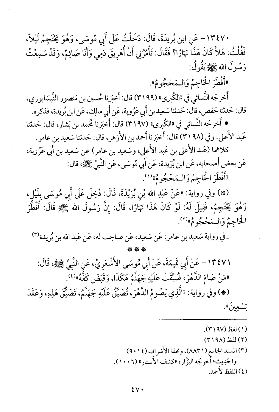 ١٣٤٧٠ - عن ابن بُريدة، قال: دخلت على أبي موسى، وهو يحتجم ليلا، فقلت: هلا كان هذا نهارا؟ فقال: تأمرني أن أهريق دمي وأنا صائم، وقد سمعت رسول الله صَلى الله عَليه وسَلم يقول: