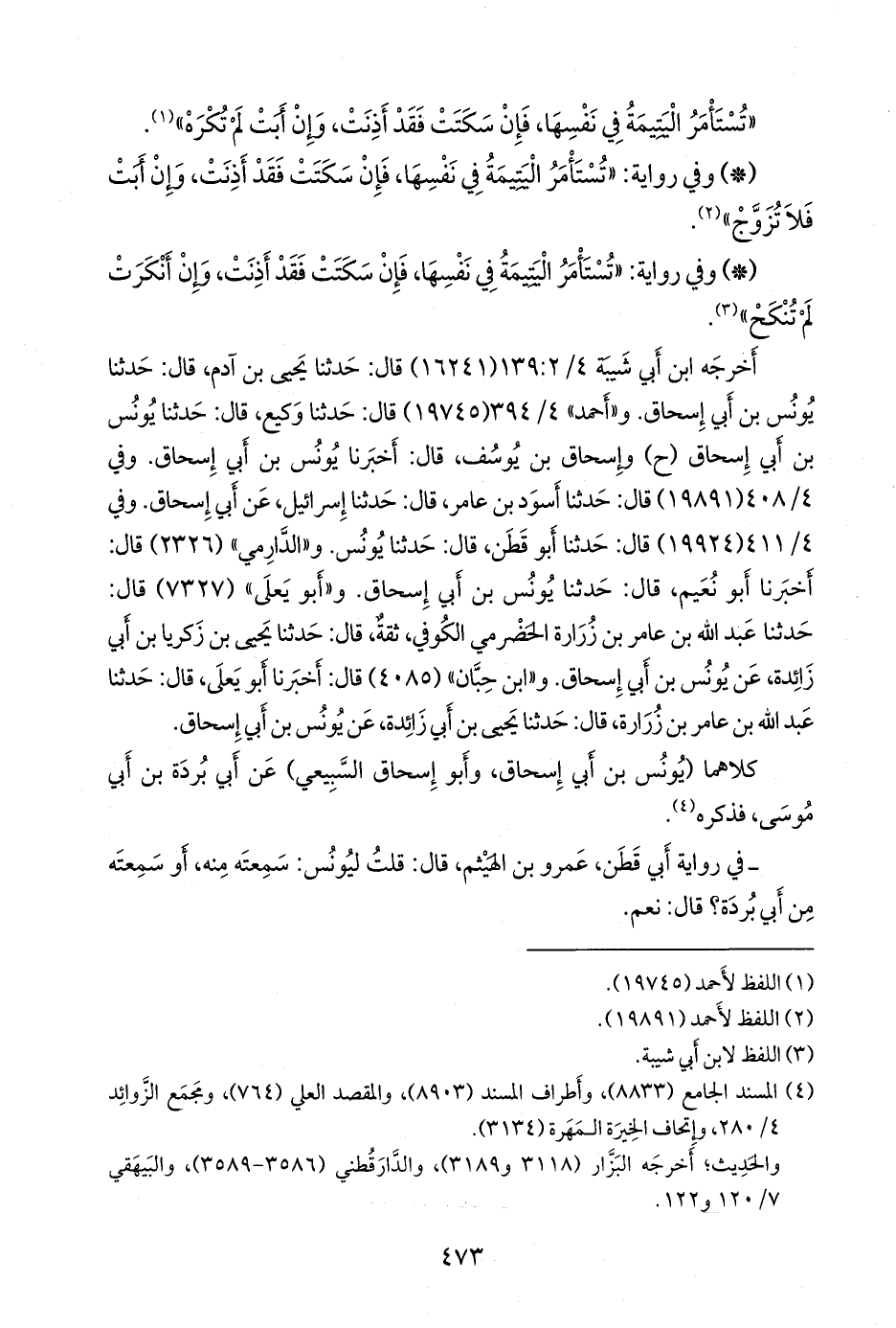 و «الدَّارِمي» (٢٣٢٦) قال: أخبرنا أَبو نُعيم، قال: حدثنا يونس بن أبي إسحاق. و «أَبو يَعلى» (٧٣٢٧) قال: حدثنا عبد الله بن عامر بن زُرارة الحضرمي الكوفي، ثقة، قال: حدثنا يحيى بن زكريا بن أبي زائدة، عن يونس بن أبي إسحاق. و «ابن حِبَّان» (٤٠٨٥) قال: أخبرنا أَبو يَعلى، قال: حدثنا عبد الله بن عامر بن زُرارة، قال: حدثنا يحيى بن أبي زائدة، عن يونس بن أبي إسحاق.