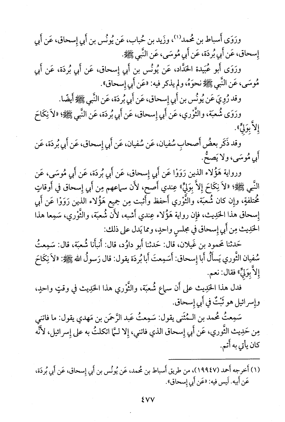 ورواية هؤلاء الذين رووا عن أبي إسحاق، عن أبي بردة، عن أبي موسى، عن النبي صَلى الله عَليه وسَلم؛ «لا نكاح إلا بولي» عندي أصح، لأن سماعهم من أبي إسحاق في أوقات مختلفة، وإن كان شعبة، والثوري أحفظ وأثبت من جميع هؤلاء الذين رووا عن أبي إسحاق هذا الحديث، فإن رواية هؤلاء عندي أشبه وأصح، لأن شعبة، والثوري، سمعا هذا الحديث من أبي إسحاق في مجلس واحد، ومما يدل على ذلك: