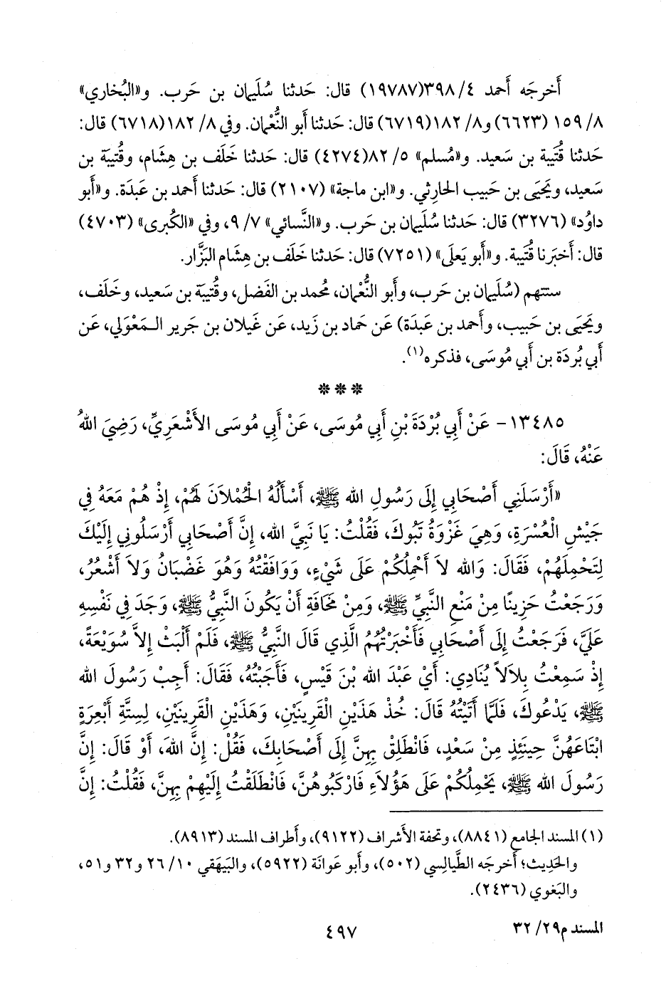 ستتهم (سليمان بن حرب، وأَبو النعمان، محمد بن الفضل، وقتيبة بن سعيد، وخلف، ويحيى بن حبيب، وأحمد بن عَبدة) عن حماد بن زيد، عن غَيلان بن جَرير المعولي، عن أبي بردة بن أبي موسى، فذكره (¬١).