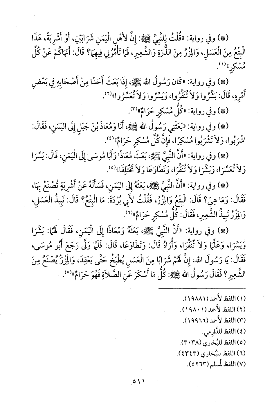 - وفي رواية: «عن أبي بردة، قال: بعث النبي صَلى الله عَليه وسَلم أبي ومعاذ بن جبل إلى اليمن، فقال: يسرا ولا تعسرا، وبشرا ولا تنفرا، وتطاوعا، فقال له أَبو موسى: إنه يصنع بأرضنا البتع؟ فقال: كل مسكر حرام» (¬٢).
