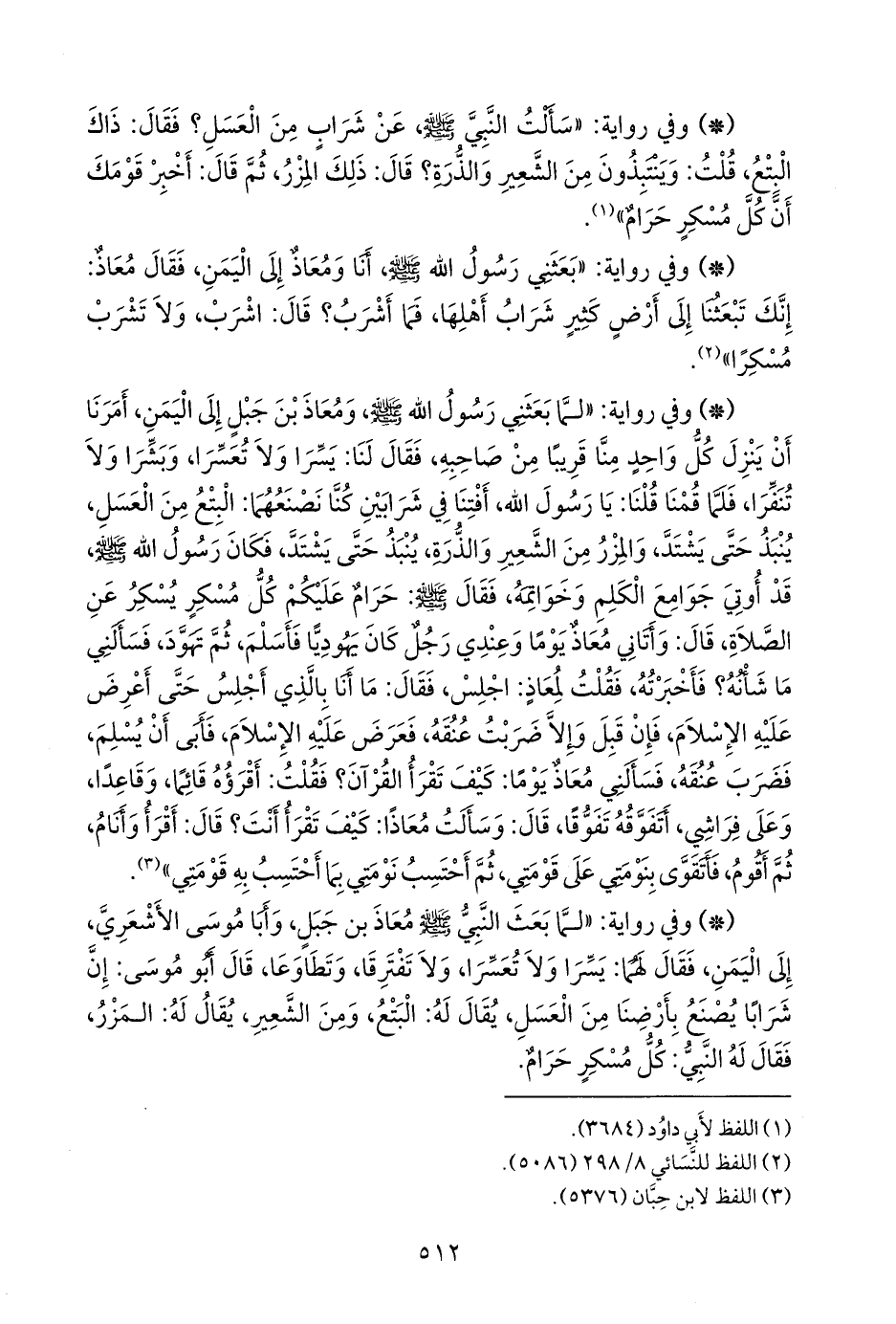 - وفي رواية: «لما بعثني رسول الله صَلى الله عَليه وسَلم ومعاذ بن جبل إلى اليمن، أمرنا أن ينزل كل واحد منا قريبا من صاحبه، فقال لنا: يسرا ولا تعسرا، وبشرا ولا تنفرا، فلما قمنا قلنا: يا رسول الله، أفتنا في شرابين كنا نصنعهما: البتع من العسل، ينبذ حتى يشتد، والمزر من الشعير والذرة، ينبذ حتى يشتد، فكان رسول الله صَلى الله عَليه وسَلم قد أوتي جوامع الكلم وخواتمه، فقال صَلى الله عَليه وسَلم: حرام عليكم كل مسكر يسكر عن الصلاة، قال: وأتاني معاذ يوما، وعندي رجل كان يهوديا فأسلم ثم تهود، فسألني ما شانه؟ فأخبرته، فقلت لمعاذ: اجلس، فقال: ما أنا بالذي أجلس حتى أعرض عليه الإسلام، فإن قبل وإلا ضربت عنقه، فعرض عليه الإسلام، فأبى أن يسلم، فضرب عنقه، فسألني معاذ يوما: كيف تقرأ القرآن؟ فقلت: أقرؤه قائما، وقاعدا، وعلى فراشي، أتفوقه تفوقا، قال: وسألت معاذا: كيف تقرأ أنت؟ قال: أقرأ وأنام، ثم أقوم، فأتقوى بنومتي على قومتي، ثم أحتسب نومتي بما أحتسب به قومتي» (¬٢)