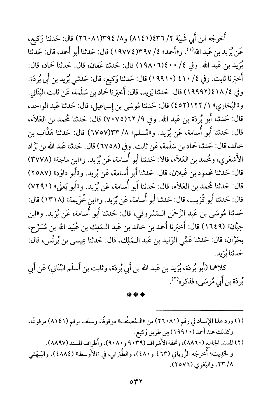 و «أحمد» ٤/ ٣٩٧ (١٩٧٧٤) قال: حدثنا أَبو أحمد، قال: حدثنا بريد بن عبد الله. وفي ٤/ ٤٠٠ (١٩٨٠٦) قال: حدثنا عفان، قال: حدثنا حماد، قال: أخبرنا ثابت. وفي ٤/ ٤١٠ (١٩٩١٠) قال: حدثنا وكيع، قال: حدثني بريد بن أبي بردة. وفي ٤/ ٤١٨ (١٩٩٩٢) قال: حدثنا يزيد، قال: أخبرنا حماد بن سلمة، عن ثابت البُنَاني. و «البخاري» ١/ ٩٨ (٤٥٢) قال: حدثنا موسى بن إسماعيل، قال: حدثنا عبد الواحد، قال: حدثنا أَبو بردة بن عبد الله. وفي ٩/ ٤٩ (٧٠٧٥) قال: حدثنا محمد بن العلاء، قال: حدثنا أَبو أُسامة، عن بريد. و «مسلم» ٨/ ٣٣ (٦٧٥٧) قال: حدثنا هداب بن خالد، قال: حدثنا حماد بن سلمة، عن ثابت. وفي (٦٧٥٨) قال: حدثنا عبد الله بن براد الأشعري، ومحمد بن العلاء، قالا: حدثنا أَبو أُسامة، عن بريد. و «ابن ماجة» (٣٧٧٨) قال: حدثنا محمود بن غَيلان، قال: حدثنا أَبو أُسامة، عن بريد. و «أَبو داود» (٢٥٨٧) قال: حدثنا محمد بن العلاء، قال: حدثنا أَبو أُسامة، عن بريد. و «أَبو يَعلى» (٧٢٩١) قال: حدثنا أَبو كُريب، قال: حدثنا أَبو أُسامة، عن بريد. و «ابن خزيمة» (١٣١٨) قال: حدثنا موسى بن عبد الرَّحمَن المسروقي، قال: حدثنا أَبو أُسامة، عن بريد. و «ابن حِبَّان» (١٦٤٩) قال: أخبرنا أحمد بن خالد بن عبد الملك بن عُبيد الله بن مسرح، بحران، قال: حدثنا عمي الوليد بن عبد الملك، قال: حدثنا عيسى بن يونس، قال: حدثنا بريد.
