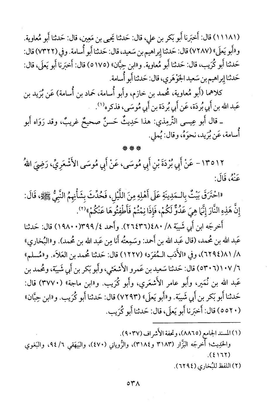 خمستهم (عبد الله بن محمد أَبو بكر بن أبي شيبة، ومحمد بن العلاء، أَبو كُريب، وسعيد بن عَمرو، ومحمد بن عبد الله، وأَبو عامر الأشعري عبد الله بن براد) عن أبي أُسامة حماد بن أُسامة، عن بريد بن عبد الله، عن أبي بردة بن أبي موسى، فذكره (¬٢).