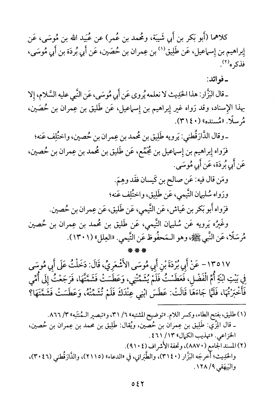 - قال البزار: هذا الحديث لا نعلمه يروى عن أبي موسى، عن النبي عليه السلام، إلا بهذا الإسناد، وقد رواه غير إبراهيم بن إسماعيل، عن طليق بن عمران بن حصين، مُرسلًا. «مسنده» (٣١٤٠).