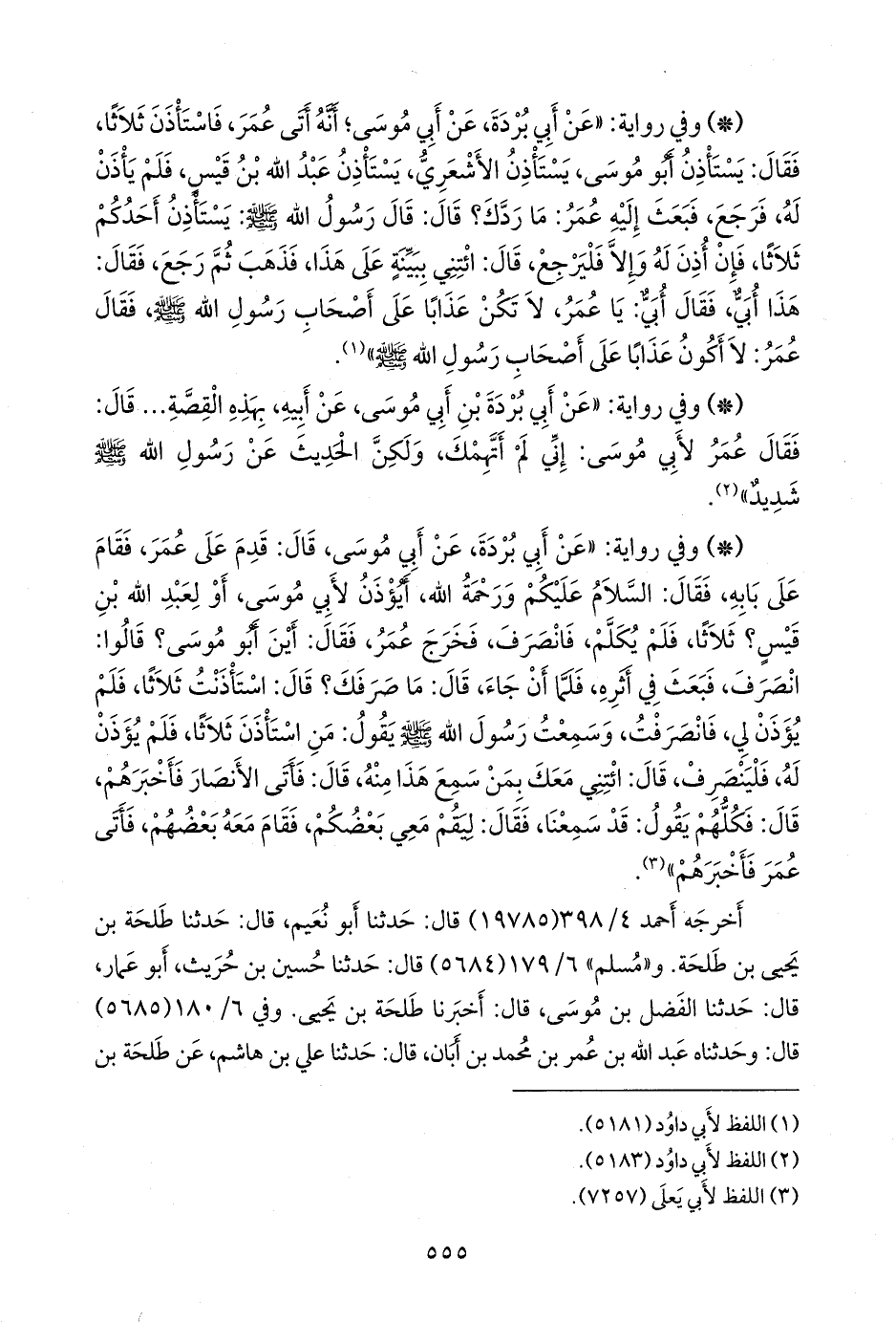 - وفي رواية: «عن أبي بردة بن أبي موسى، عن أبيه، بهذه القصة ... قال: فقال عمر لأبي موسى: إني لم أتهمك، ولكن الحديث عن رسول الله صَلى الله عَليه وسَلم شديد» (¬١).