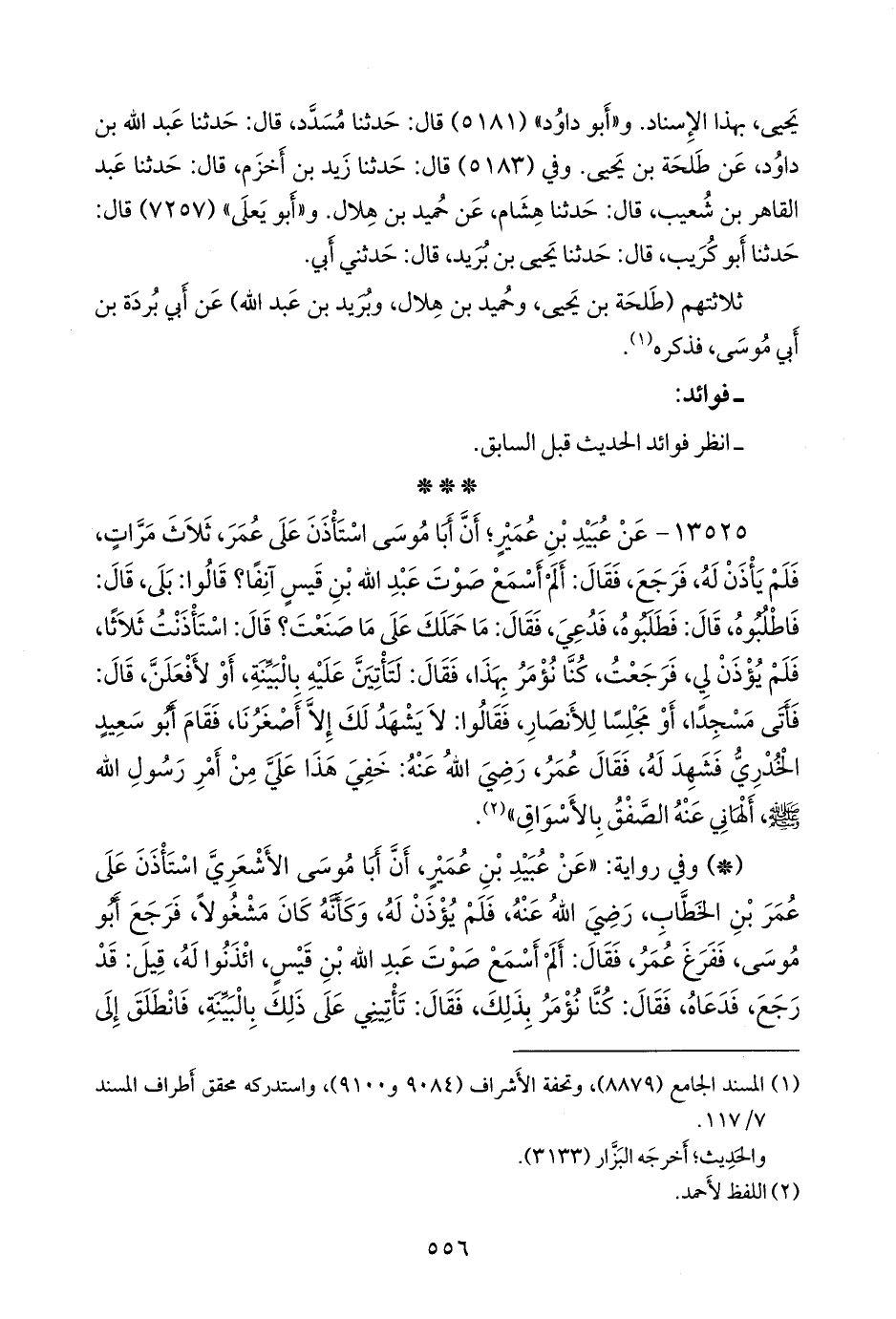 - وفي رواية: «عن عُبيد بن عُمير، أن أبا موسى الأشعري استأذن على عمر بن الخطاب، رضي الله عنه، فلم يؤذن له، وكأنه كان مشغولا، فرجع أَبو موسى، ففرغ عمر، فقال: ألم أسمع صوت عبد الله بن قيس، ائذنوا له، قيل: قد رجع، فدعاه، فقال: كنا نؤمر بذلك، فقال: تأتيني على ذلك بالبينة، فانطلق إلى