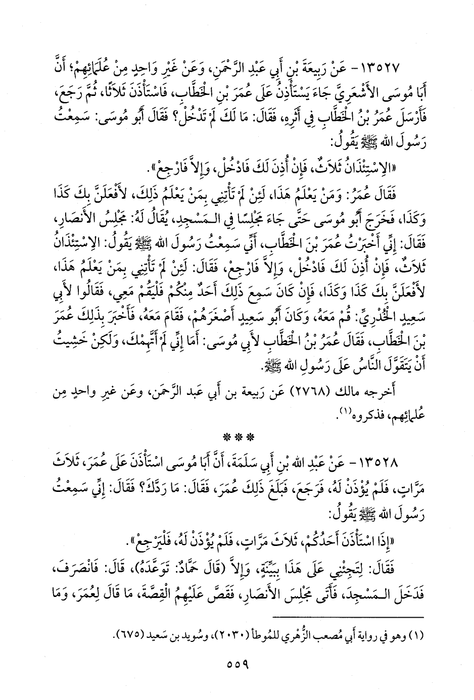 ١٣٥٢٨ - عن عبد الله بن أبي سلمة، أن أبا موسى استأذن على عمر، ثلاث مرات، فلم يؤذن له، فرجع، فبلغ ذلك عمر، فقال: ما ردك؟ فقال: إني سمعت رسول الله صَلى الله عَليه وسَلم يقول: